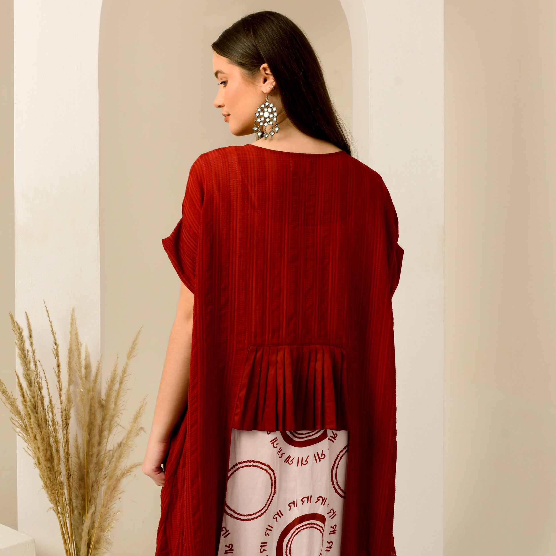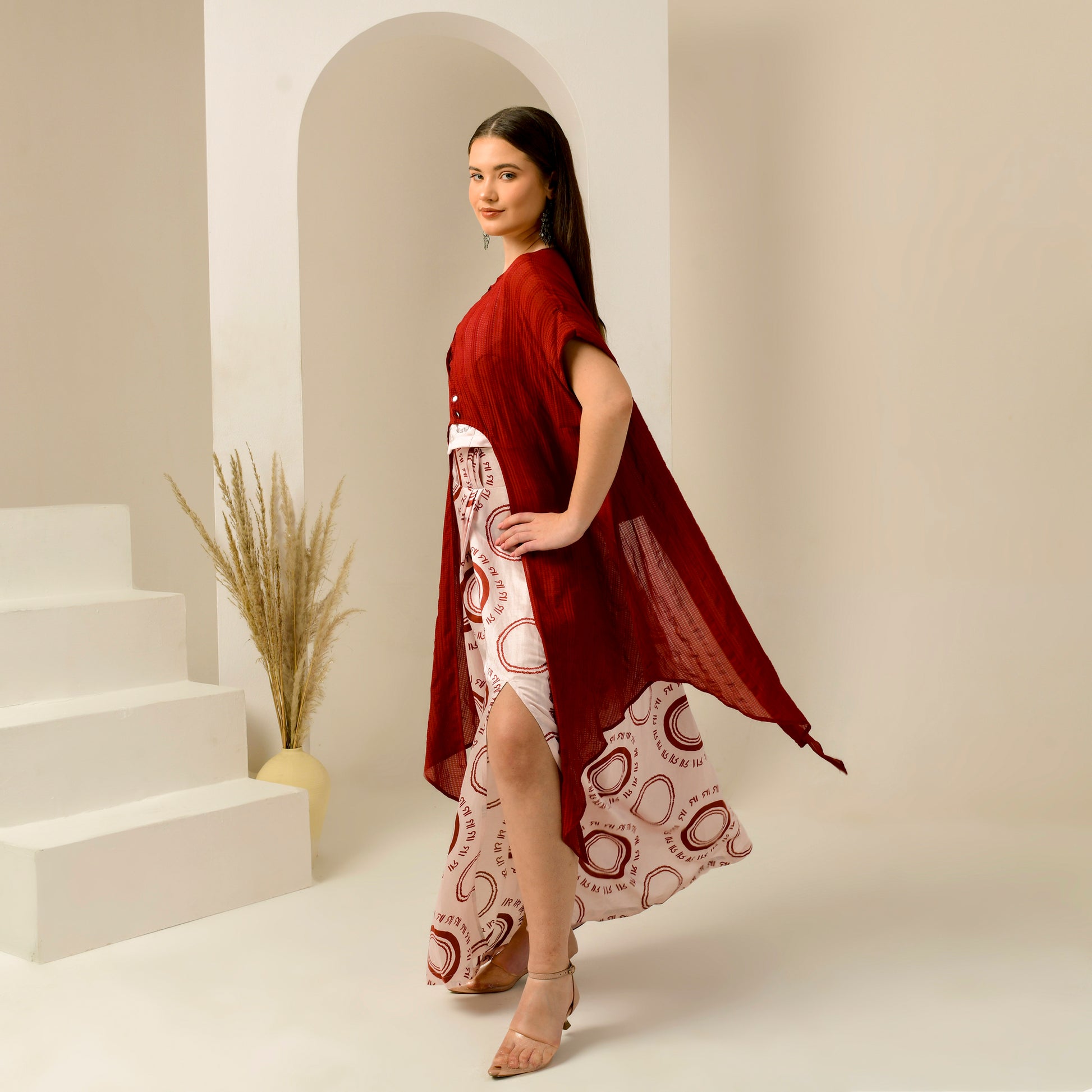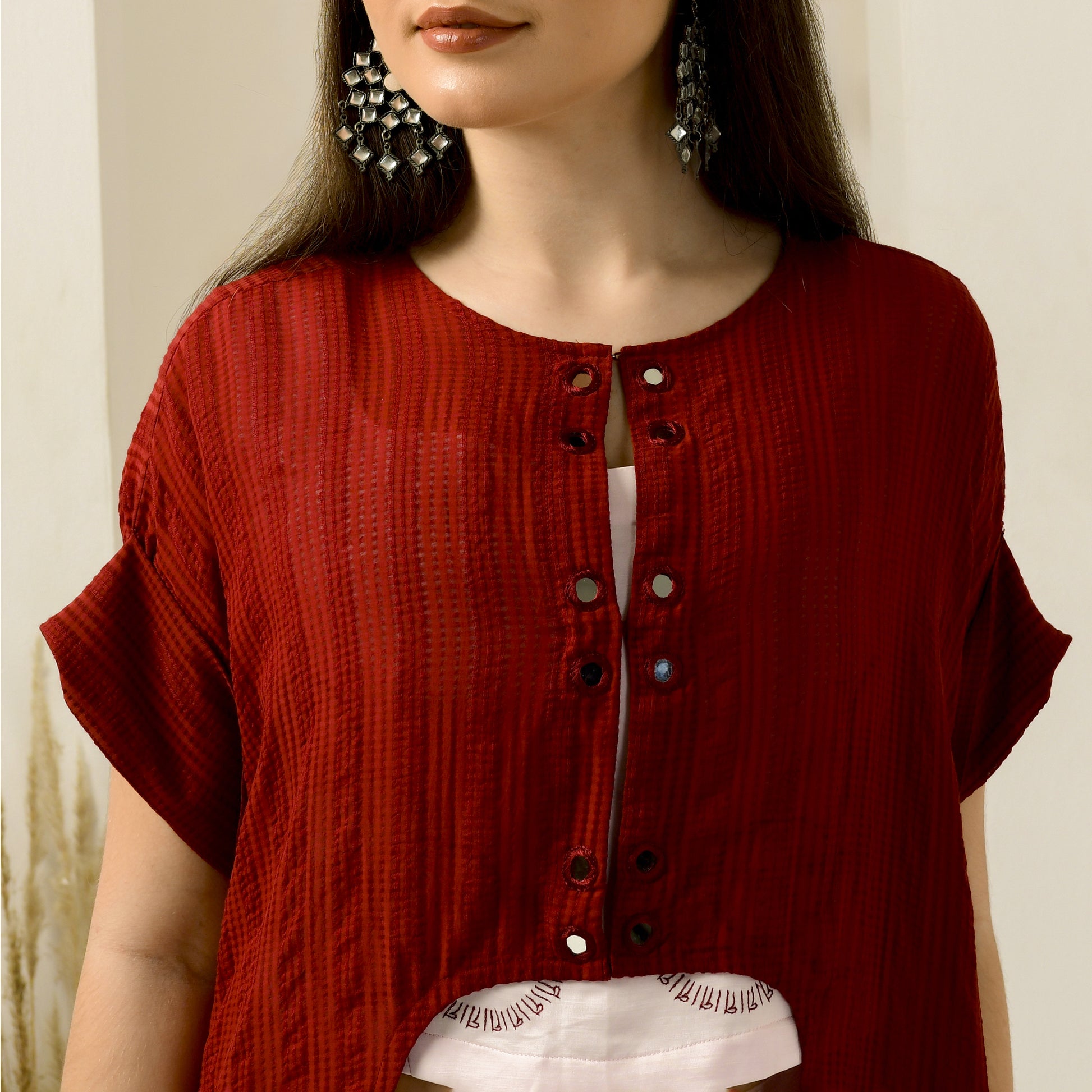 Style Guide Style the hand embroidered cover-up and crop top with maa print full-length skirt set by pairing it with bold statement jewellery like chandelier earrings or a layered necklace to accentuate its vibrant design. Opt for heels or embellished sandals to add a touch of glamour while elongating your silhouette. A matching potli bag or a metallic clutch complements the ensemble beautifully. Keep your hair in a sleek ponytail or soft curls to balance the embroidered cover-up and crew-neck crop top. Enhance the look with bold eyeliner and a pop of colour on the lips for a festive finish.