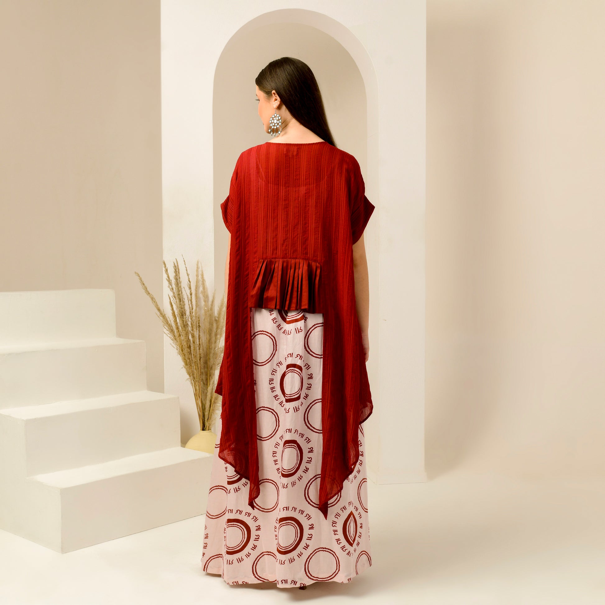 Pink and Red Hand Embroidered Cover-Up and Crop Top with Maa Print Full Length Skirt Set