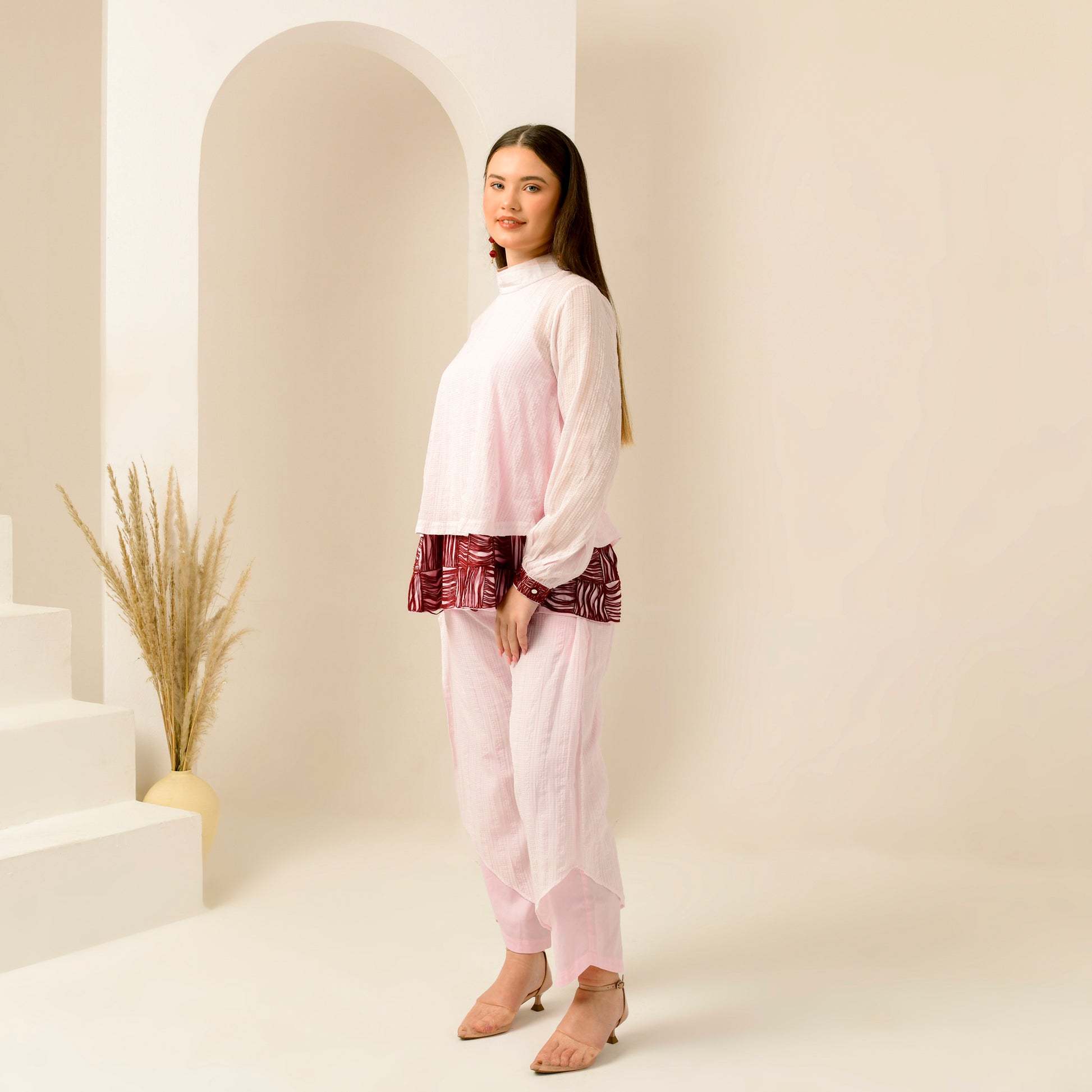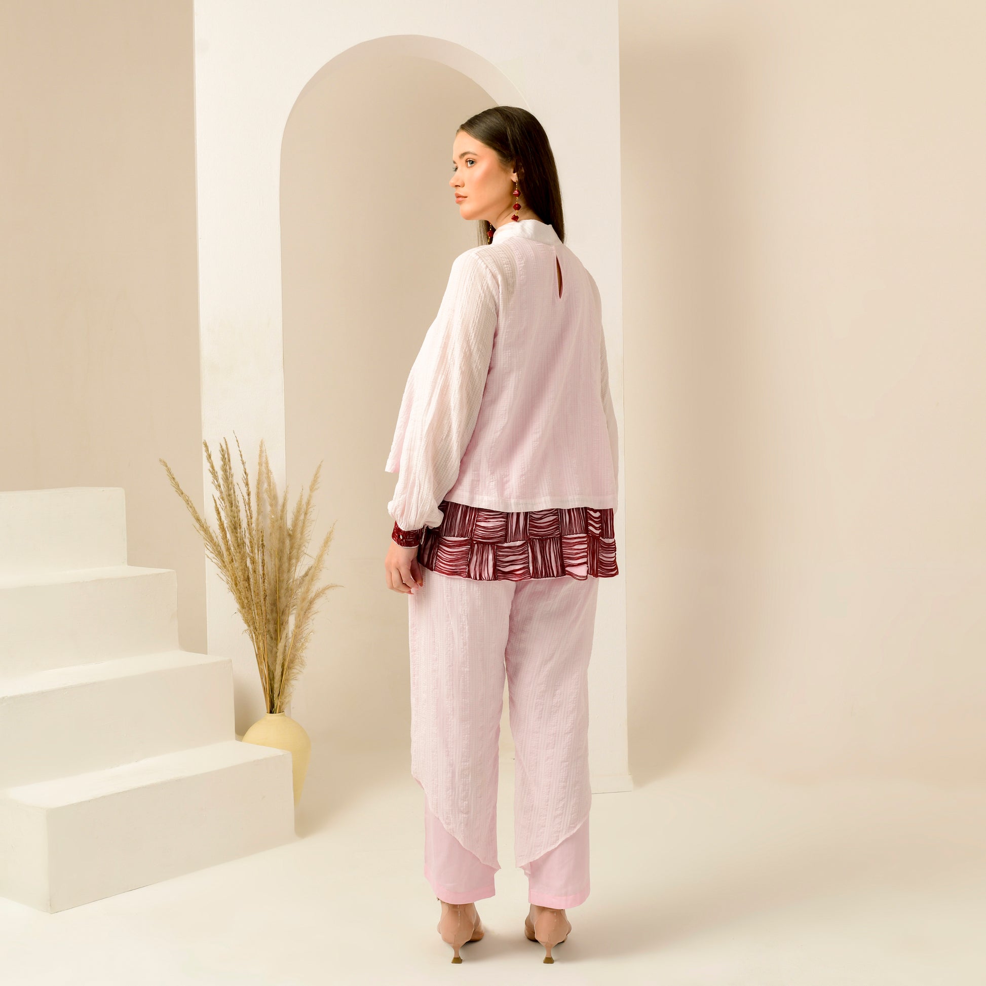 Pink and Red Hand Embroidered High Neck Top and Layered Trouser Set