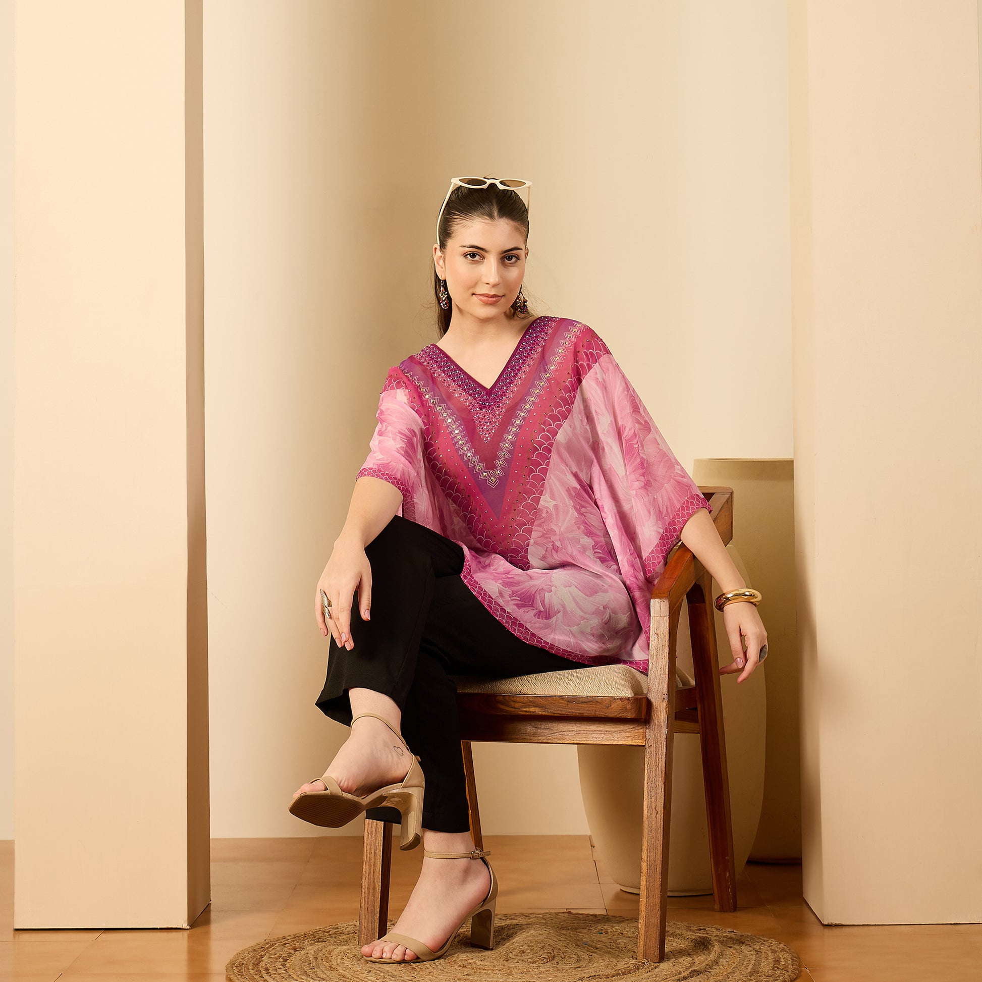 Description Bring a fresh and youthful vibe to your wardrobe with this floral-printed tunic, perfect for a trendy yet effortless look. The neckline is adorned with delicate crystal embellishments, adding a subtle sparkle that elevates the overall design.