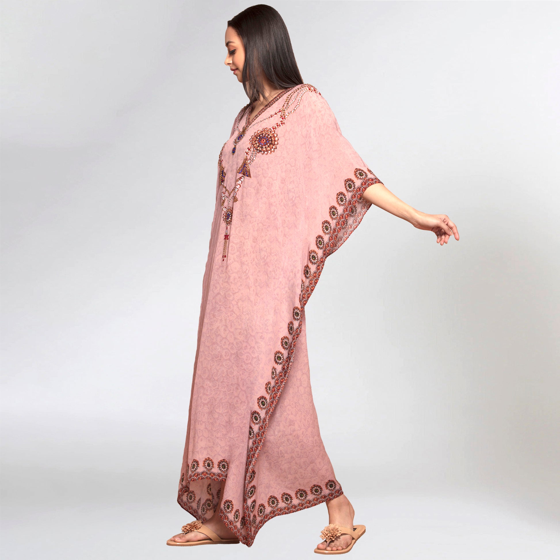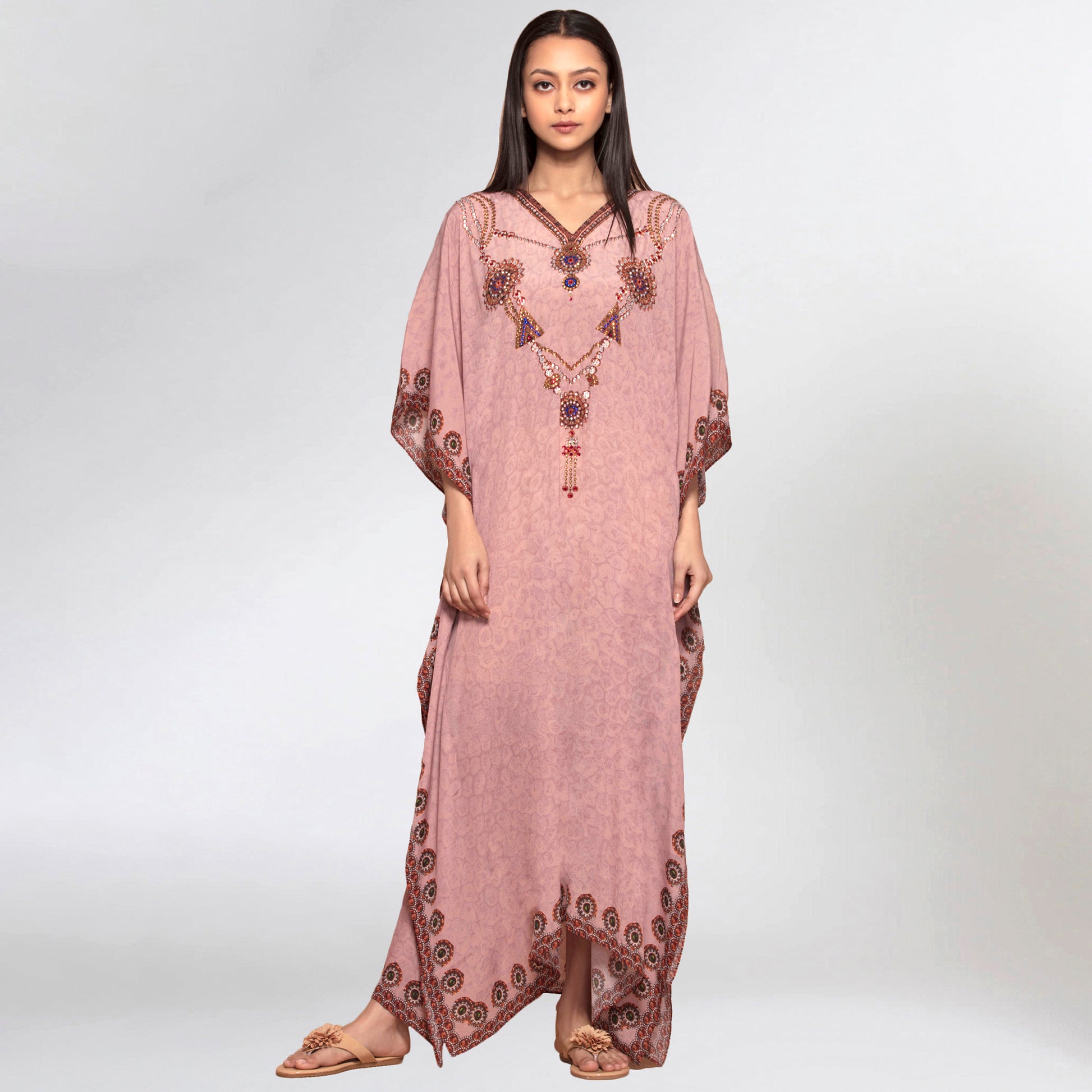 Style Guide Consider styling this full length kaftan with wedge sandals or espadrilles to enhance the free-spirited feel. The crystal detailing makes a statement, so keep accessories simple with delicate bracelets or earrings. Whether you're strolling through the city or attending a beachside gathering, this kaftan exudes a blend of cultural charm and refined style, ensuring you stand out with grace and flair.