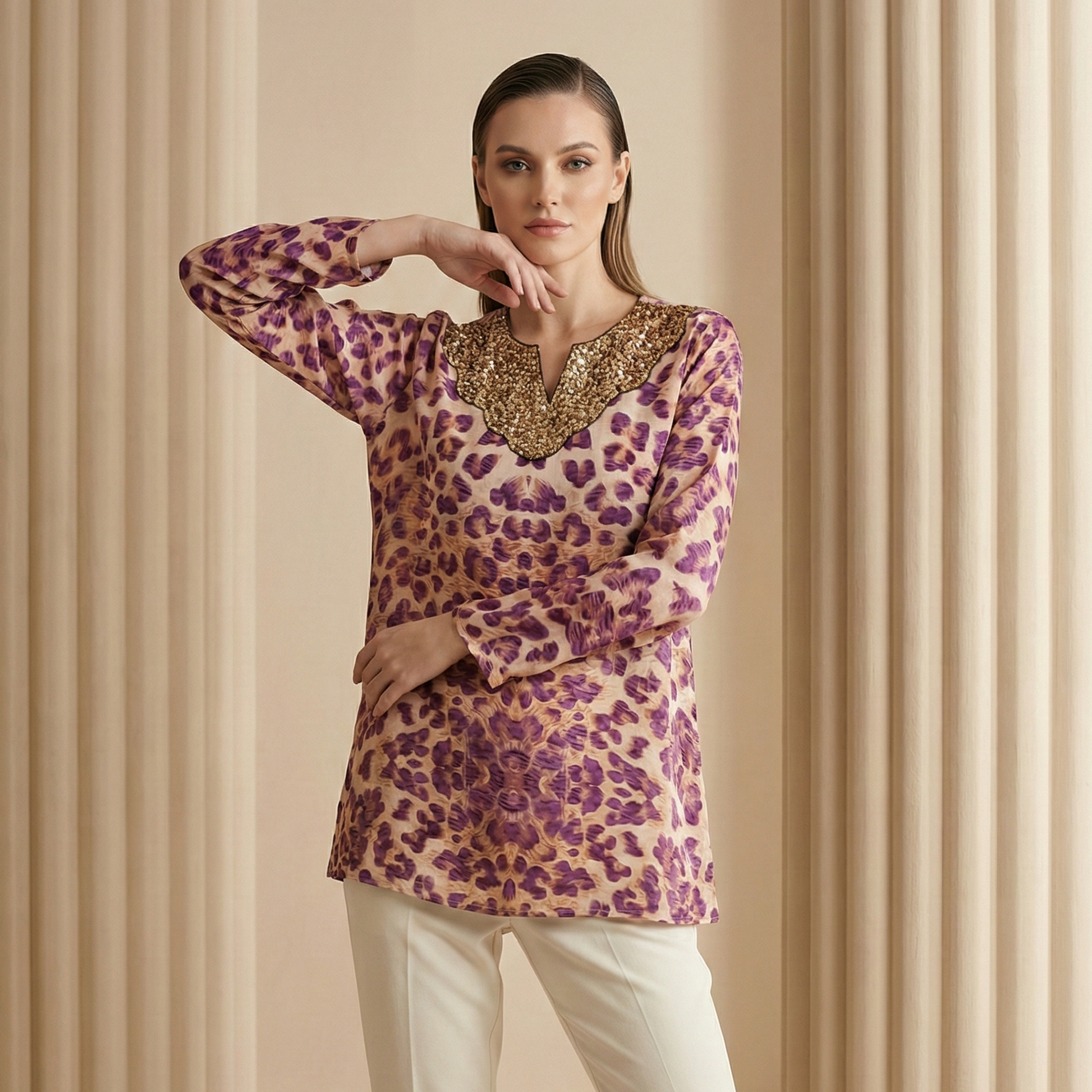Description A striking printed tunic tailored in a relaxed silhouette that merges contemporary charm with elevated detailing. Designed with a sharp collared neckline and subtle embellishment accents, it brings structure while maintaining effortless fluidity. The statement sleeves feature intricate surface work that adds movement and texture, making the piece both refined and distinctive.
