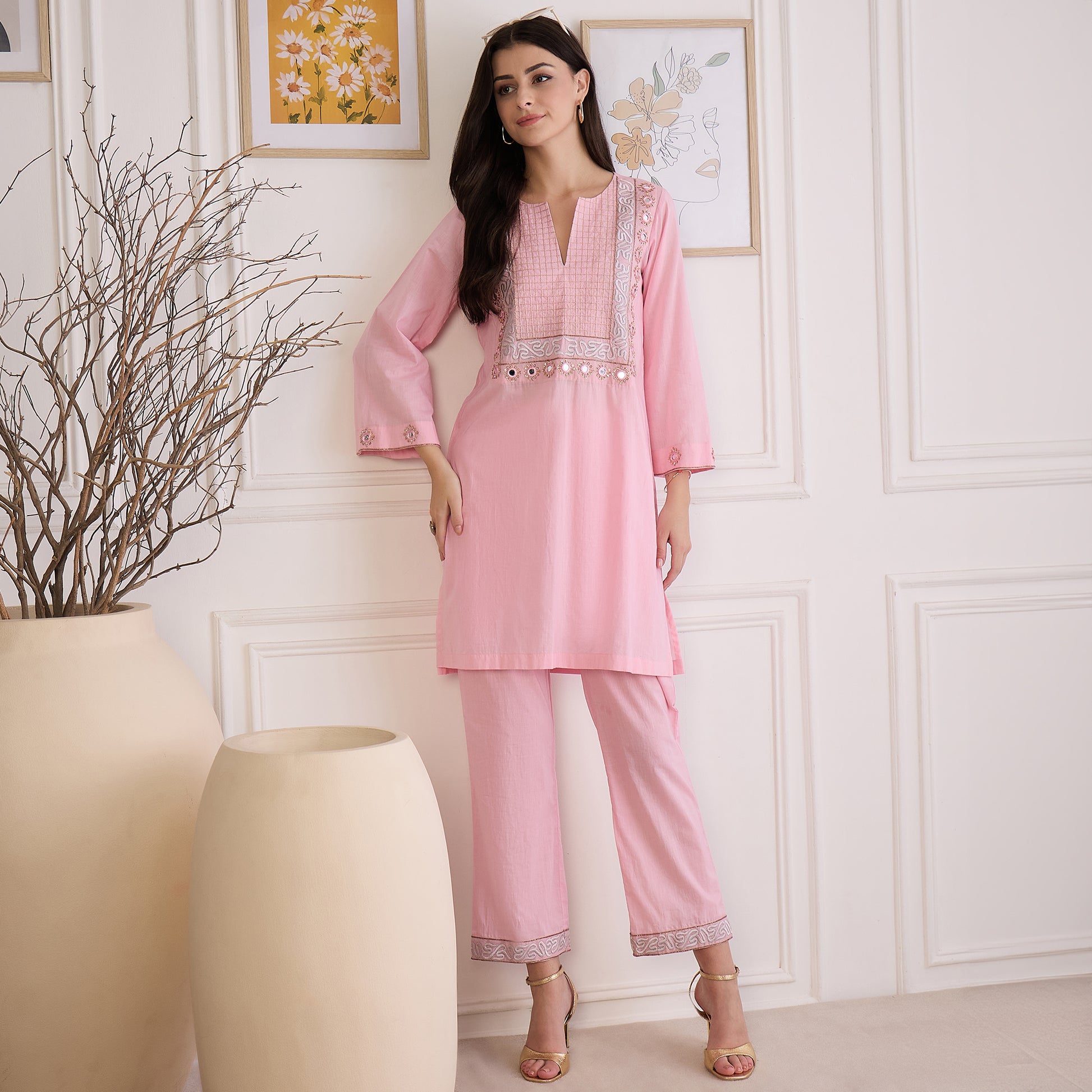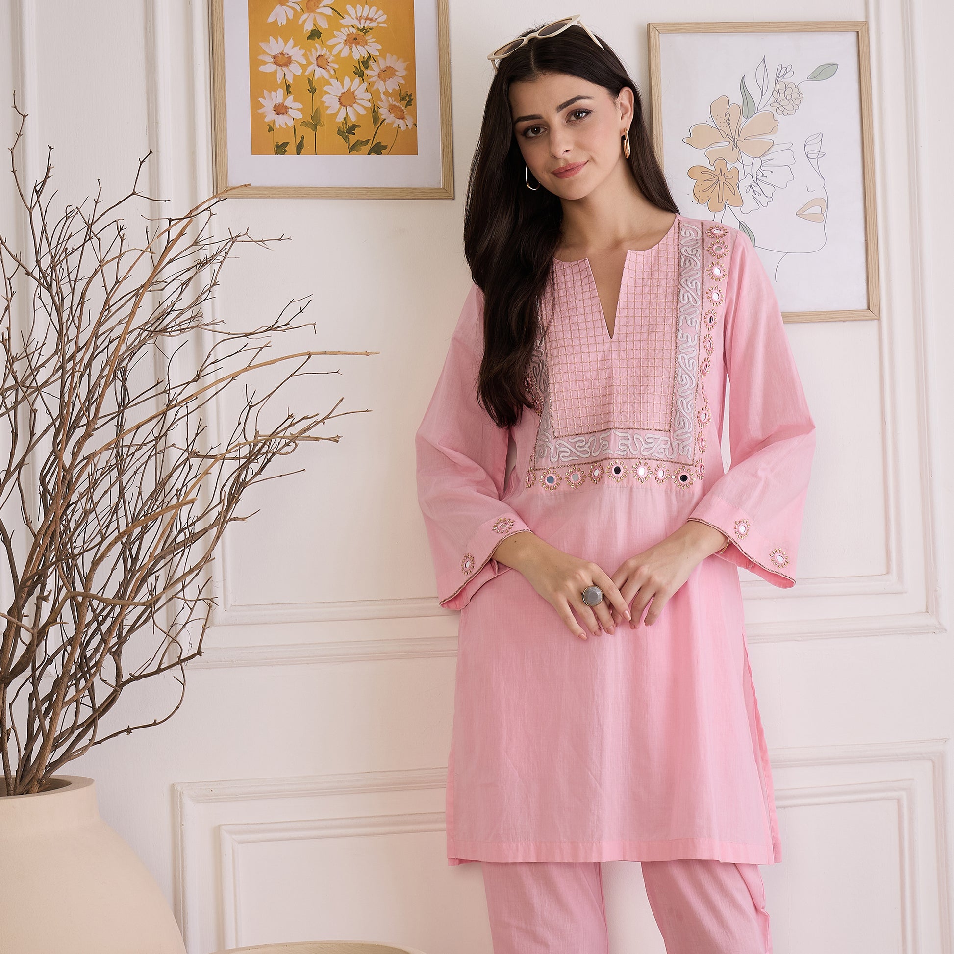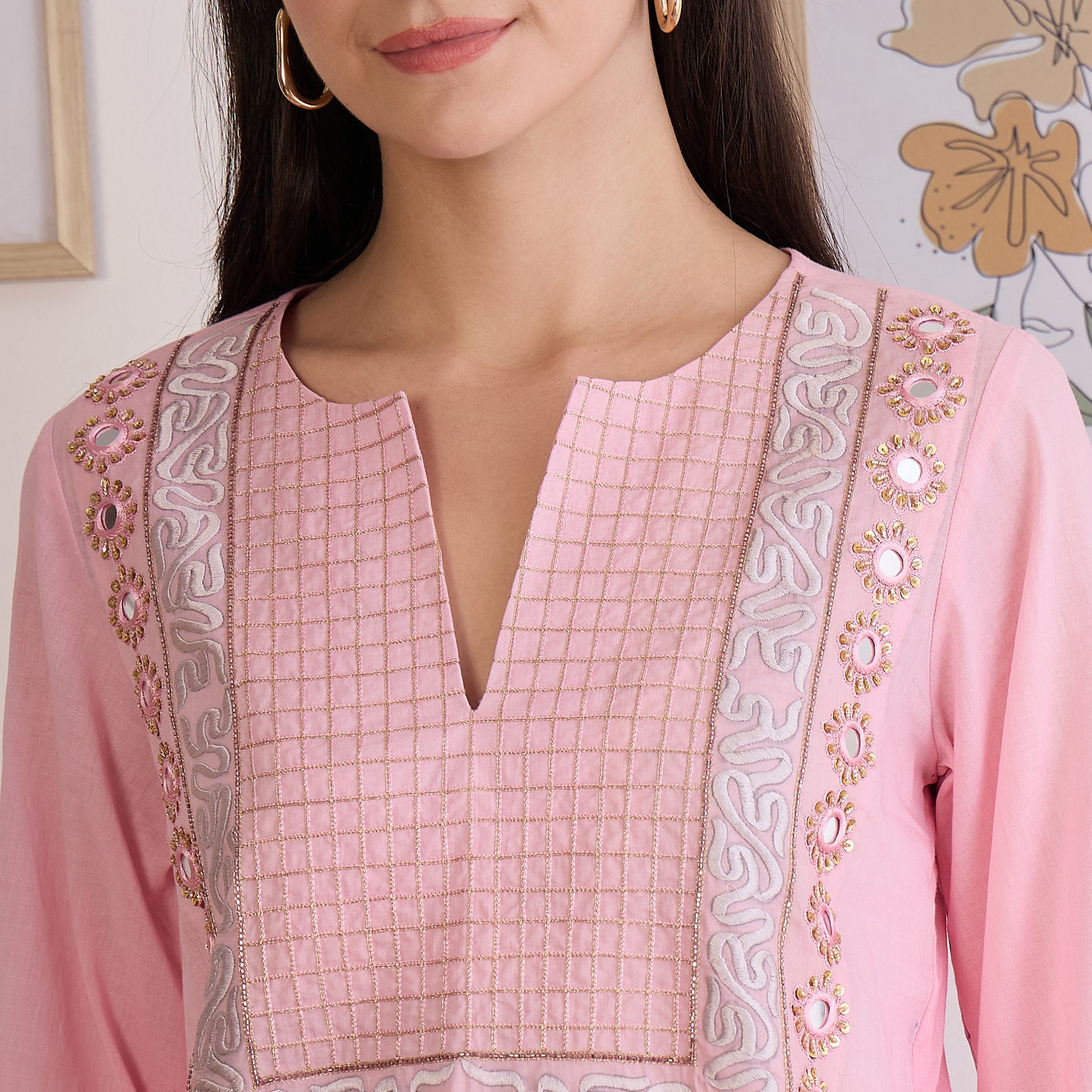 Style Guide Pair this beautifully embroidered top with tailored trousers or a flowing skirt to showcase its rich detailing. Keep accessories understated—opt for delicate gold jewelry to complement the zari work without overpowering it. Complete the look with heeled sandals and a chic clutch. Style your hair in soft curls or a sleek bun, and choose warm, glowing makeup to enhance the elegant shimmer.
