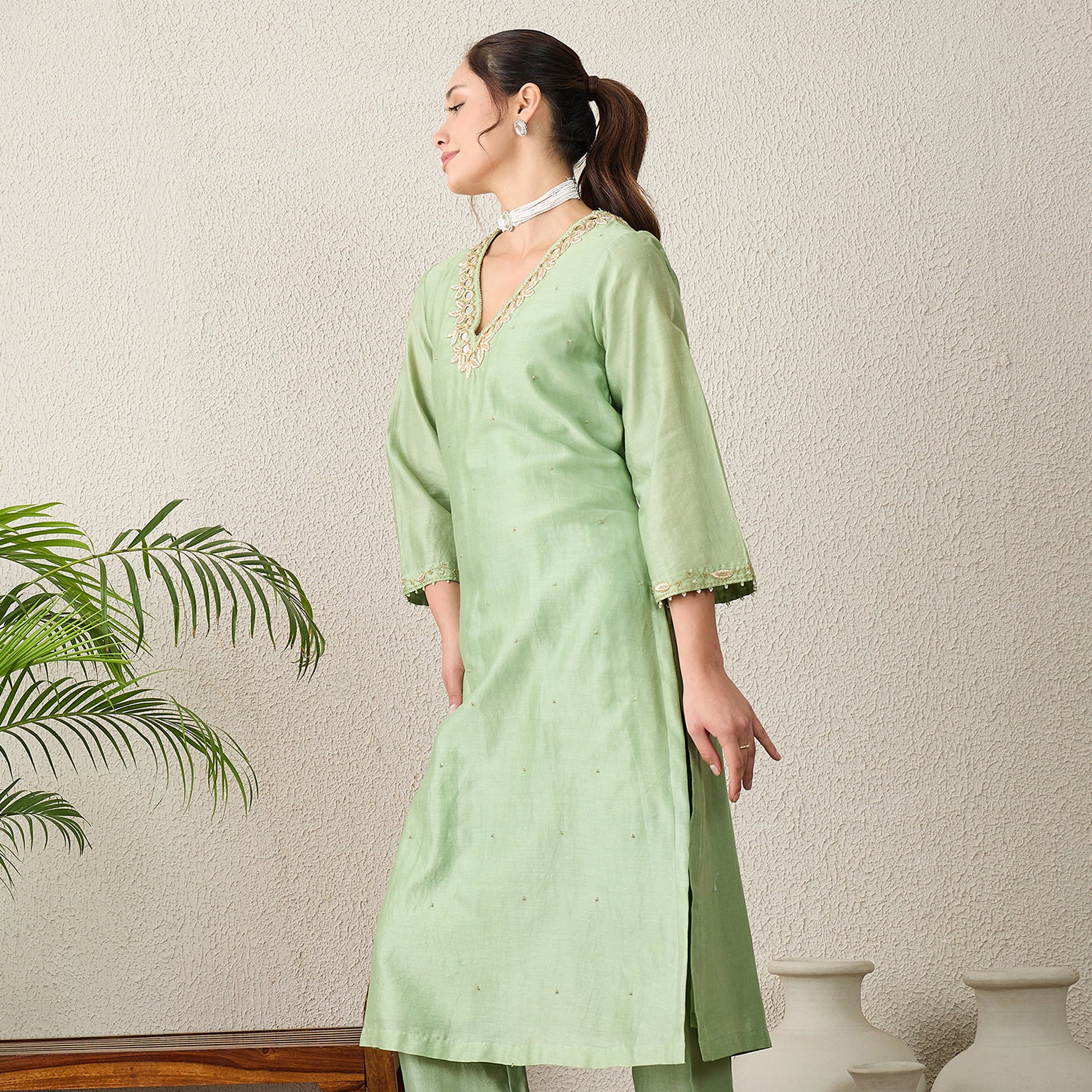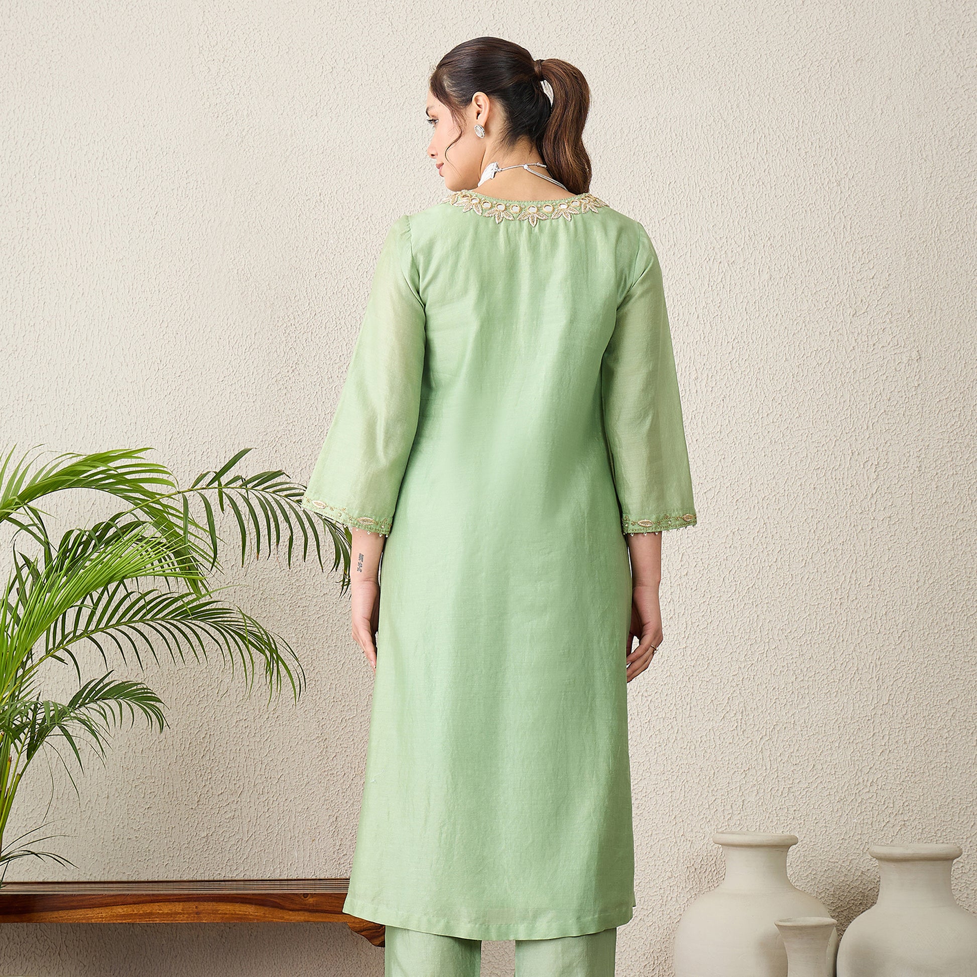 Style Guide For a polished look, pair this kurta with matching straight-fit trousers to create a clean, monochromatic silhouette. Accentuate the detailed neckline with a beaded choker and complete the ensemble with metallic high heels for added sophistication. This outfit is perfect for festive occasions or formal gatherings where you want to feel both comfortable and stylish.