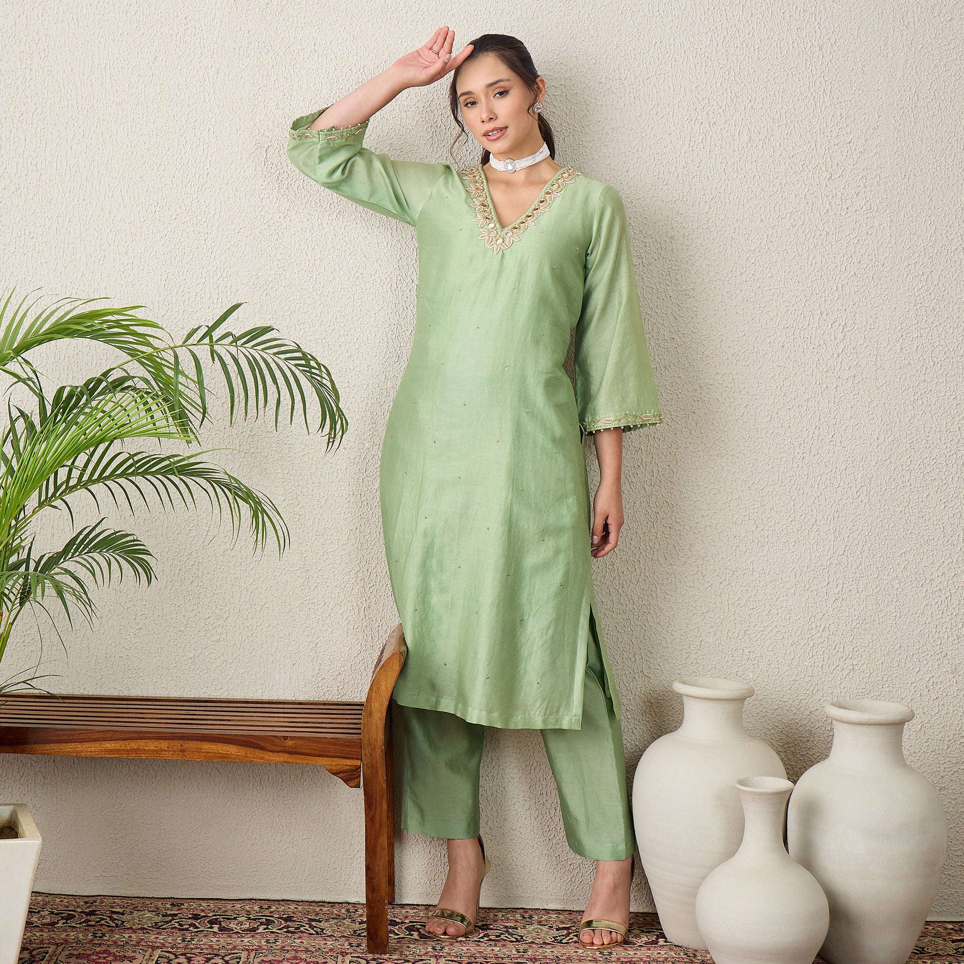 Pistacchio Green Yoke Embroidered Kurta with Pants Set