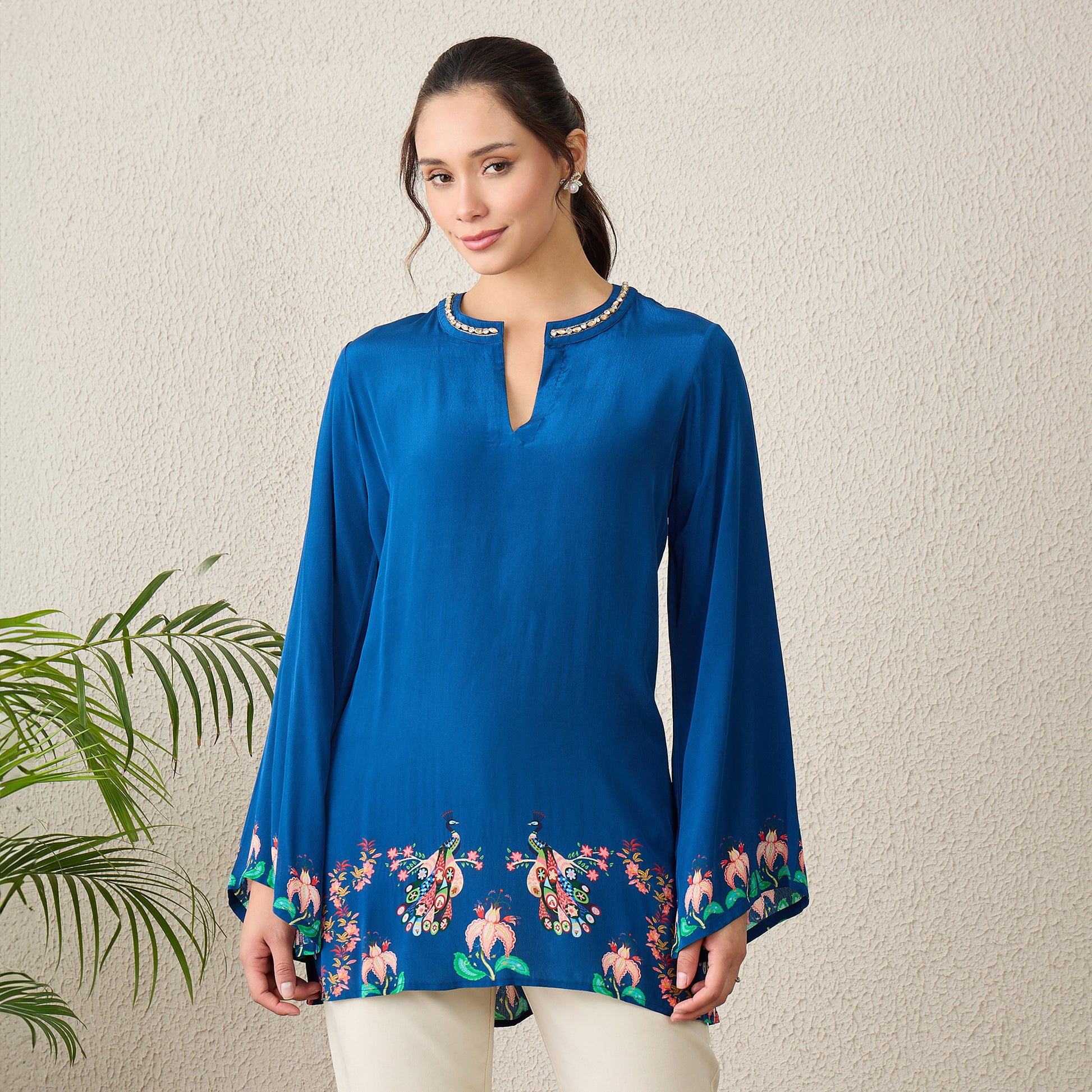 Prussian Blue Peacock Floral Printed Hand-Embroidered Top
