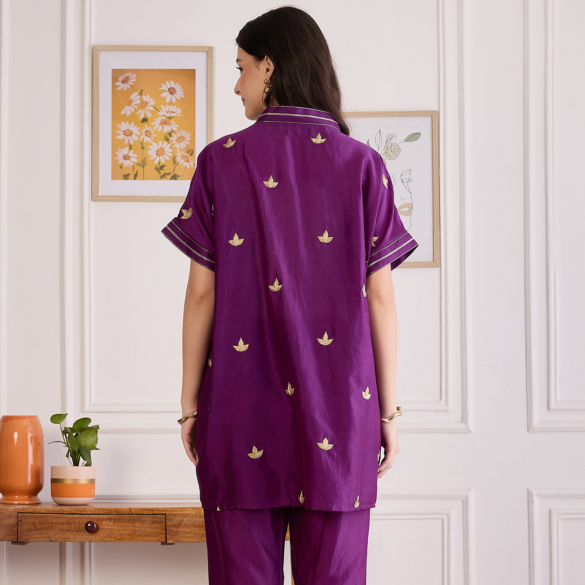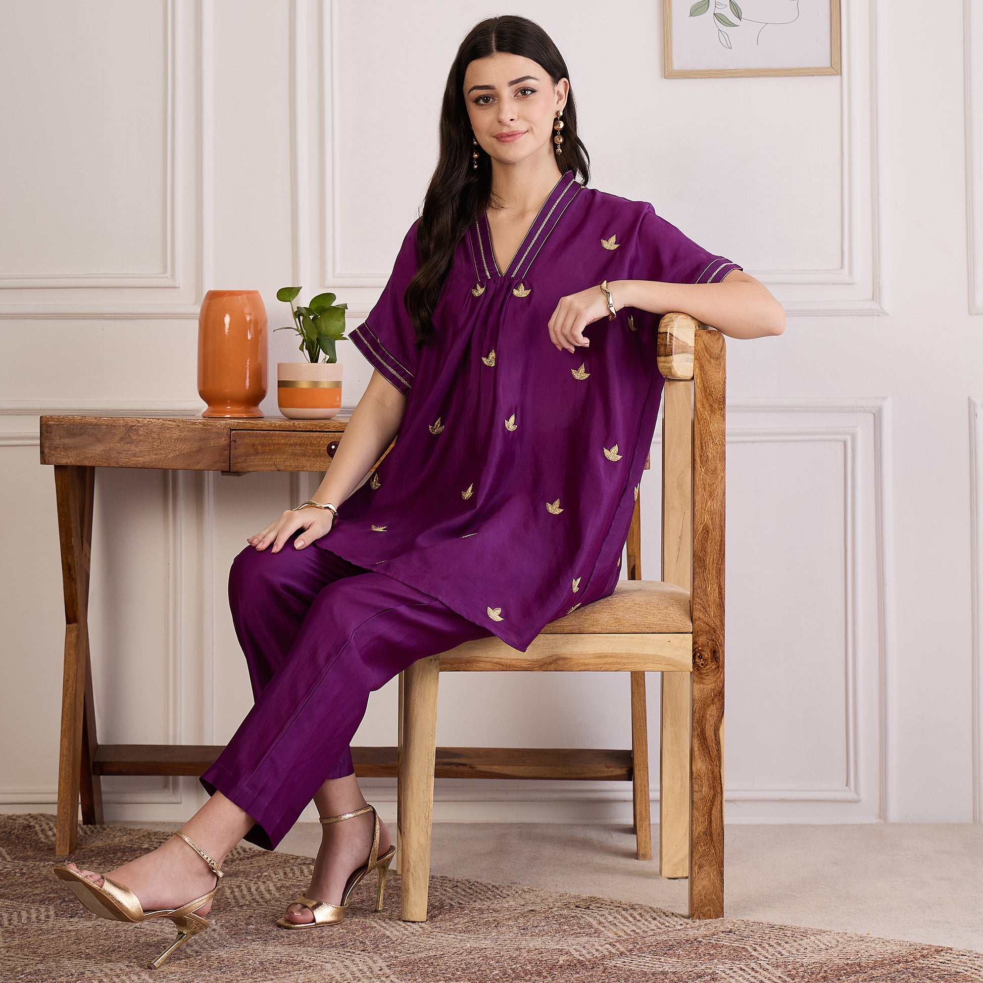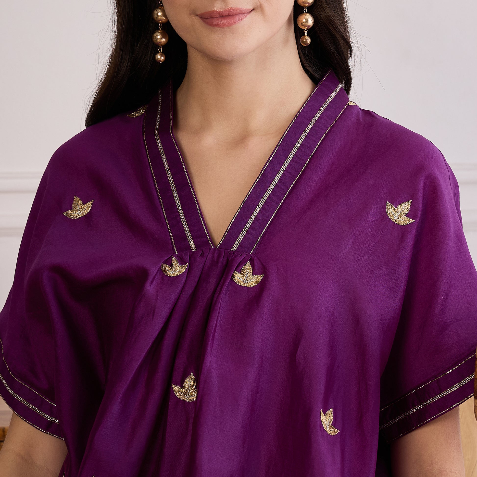 Style Guide Style this zari-embroidered top with straight-leg trousers or a flared palazzo for a graceful, balanced look. The soft gathers add volume, so pair with sleek bottoms to highlight the silhouette. Complement the zari work with gold-tone jewelry—think minimalist earrings or a thin layered necklace. Block heels or embellished juttis make the perfect footwear choice, while a clutch or structured tote finishes the look. Keep your makeup radiant with warm tones and add a low bun or side-parted waves for an elegant touch.