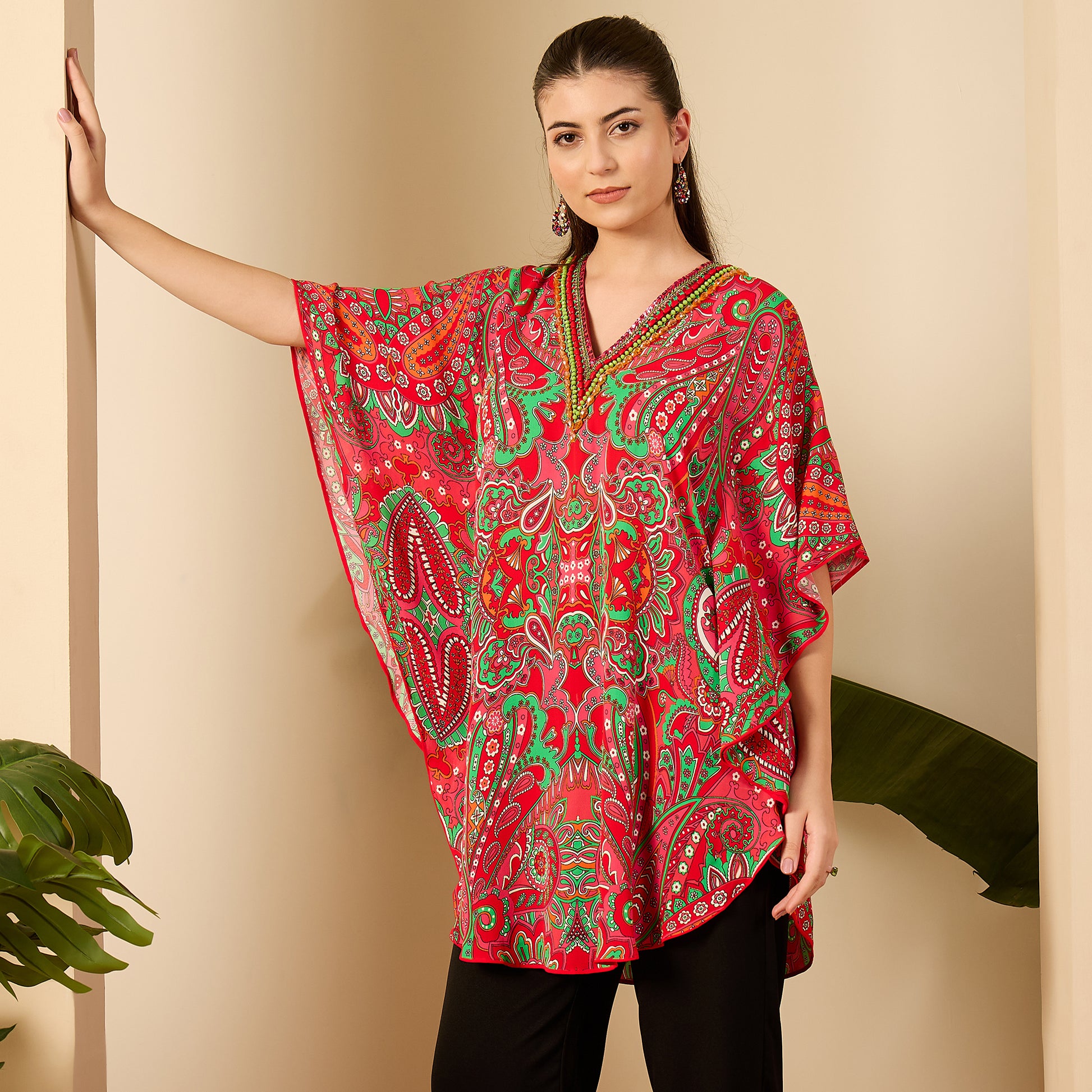 Description Modern paisley print tunic embellished with hand embroidered beadwork at the neckline. You can pair it up with tulip pants and dupatta for a statement Indo-Western look.