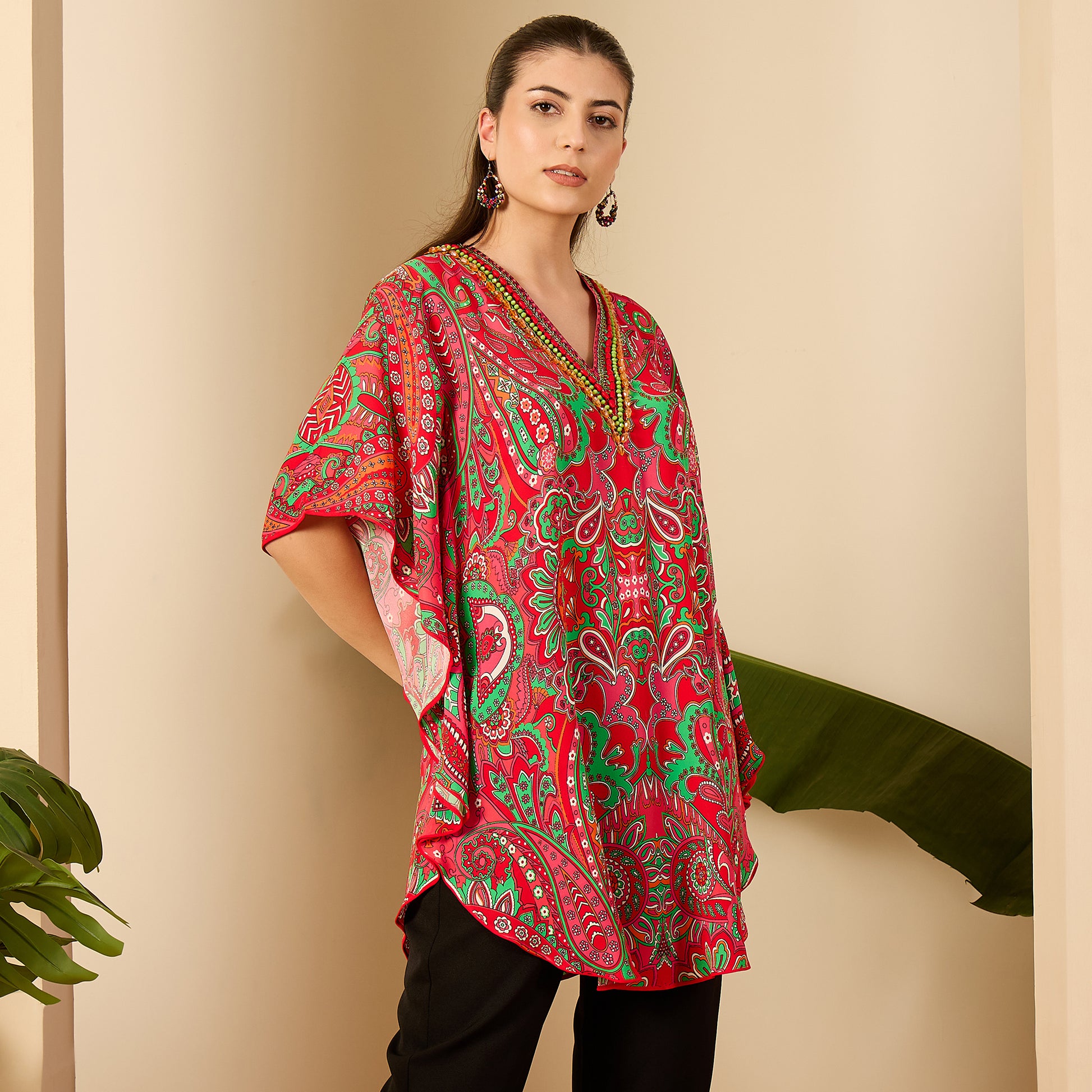 Style Guide Infuse bohemian flair into your wardrobe with our paisley printed tunic adorned with delicate bead hand embroidery on the neckline. For a daytime look, pair it with denim jeans, and slip into comfy sandals. Let the intricate beadwork stand out by keeping accessories minimal. Transition seamlessly into the evening by swapping out the shorts for tailored trousers or a into-western tulip pants, adding heels for an elevated touch. Experiment with a wide-brimmed hat or layered bracelets to embrace the free-spirited vibe of this tunic.