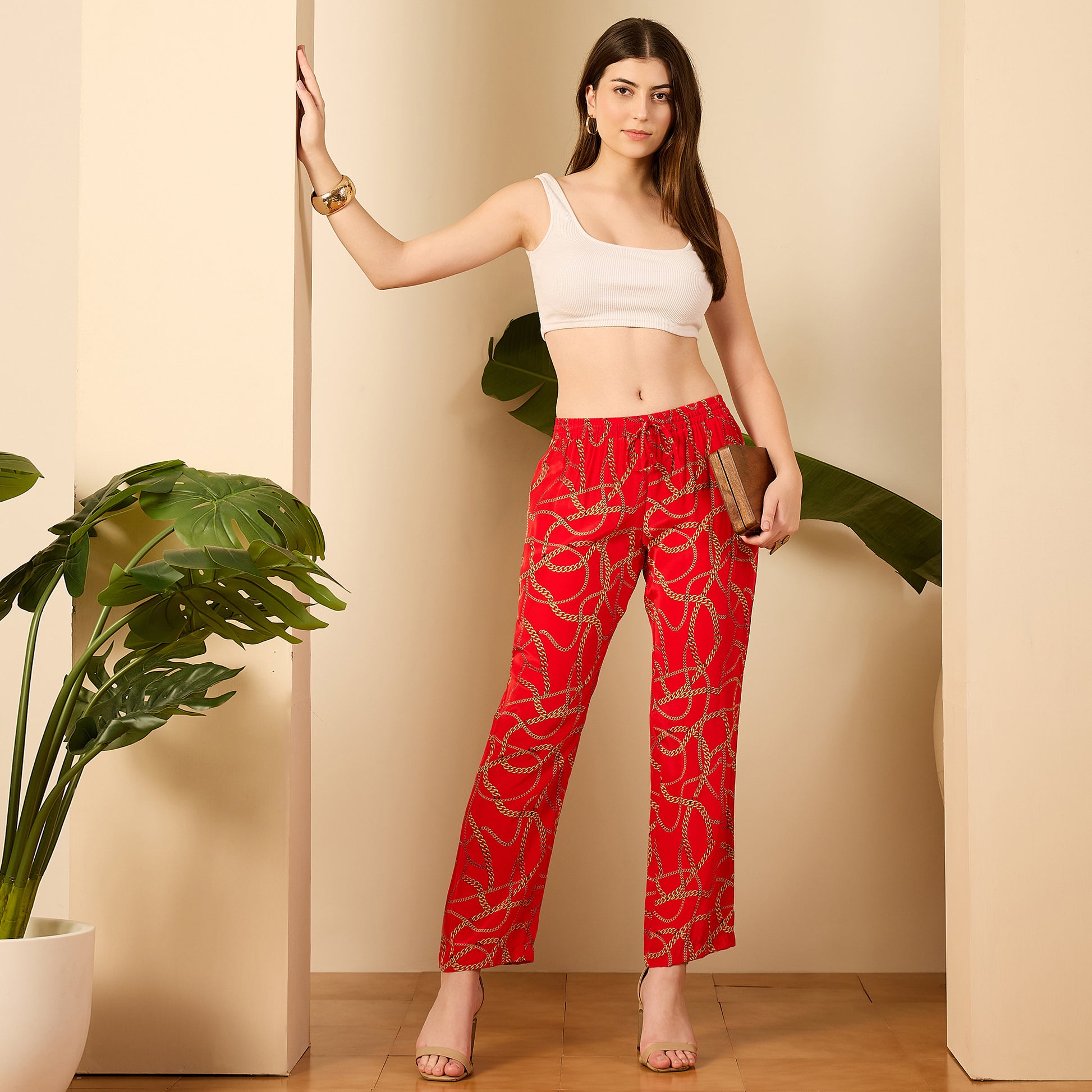 Style Guide To style the chain print pant, pair it with a simple, solid-coloured top to let the bold pattern stand out. The elasticated waistband ensures a comfortable fit, so choose a tucked-in or cropped top to highlight this feature. Opt for sleek, minimal accessories to keep the focus on the eye-catching print. Complement the look with neutral or matching footwear to maintain a cohesive appearance. It is ideal for both casual and semi-formal settings.