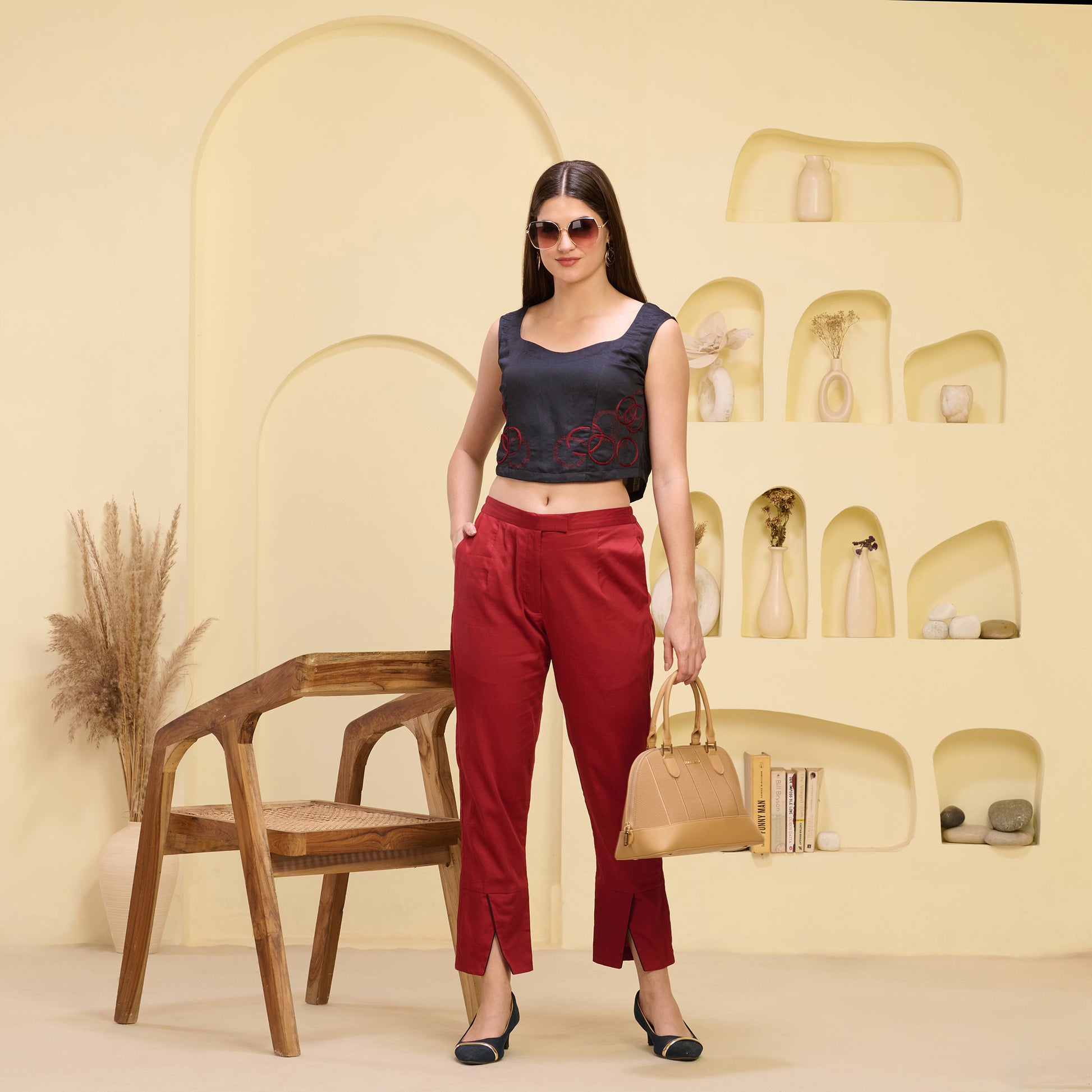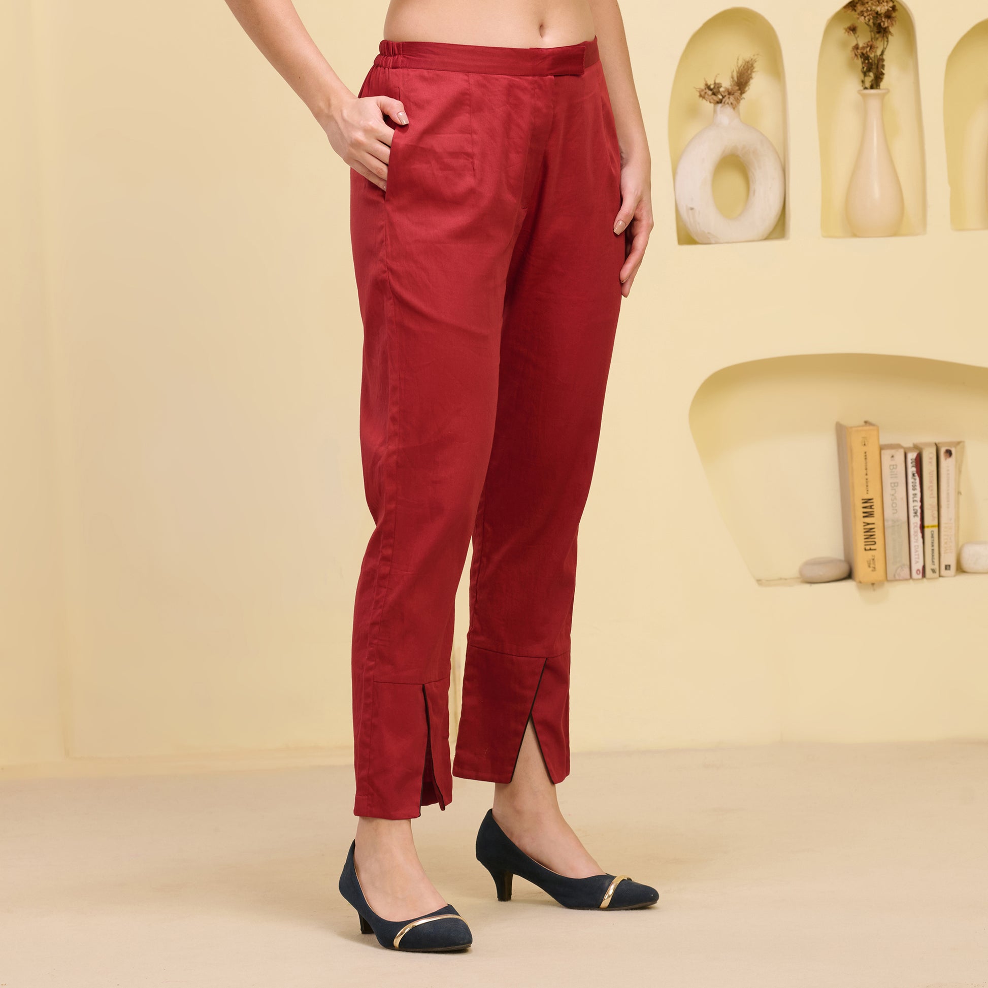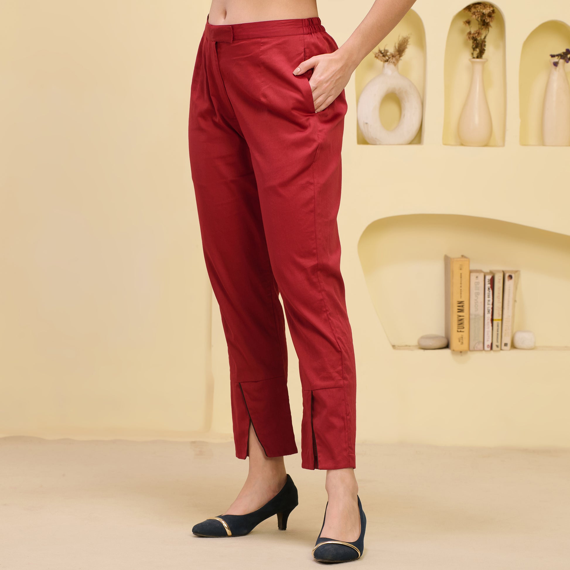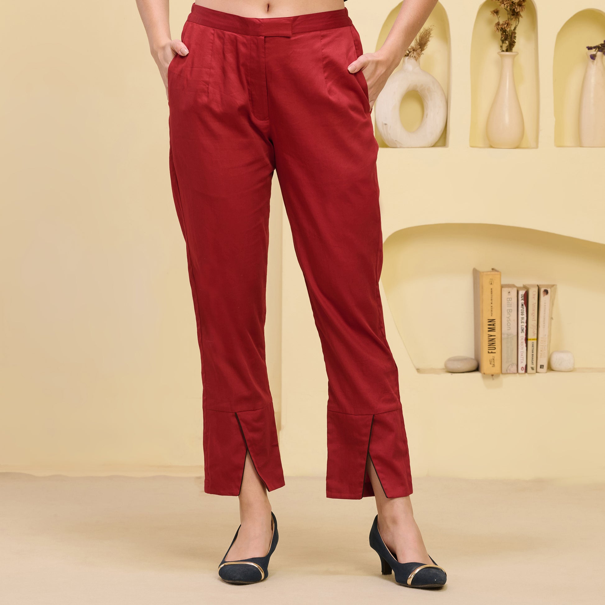 Style Guide Style these straight trousers with cross hemline by pairing them with a fitted top or a tucked-in blouse to showcase their modern silhouette and unique hemline. Add a tailored blazer or an oversized cardigan for a chic, layered look that’s perfect for work or casual meetups. For footwear, opt for sleek ankle boots or pointed flats to maintain the trouser's polished yet contemporary vibe. Keep accessories minimal with delicate gold jewellery or a statement watch to complement the trouser's simplicity. Complete the outfit with a structured bag or a crossbody to add sophistication and functionality.