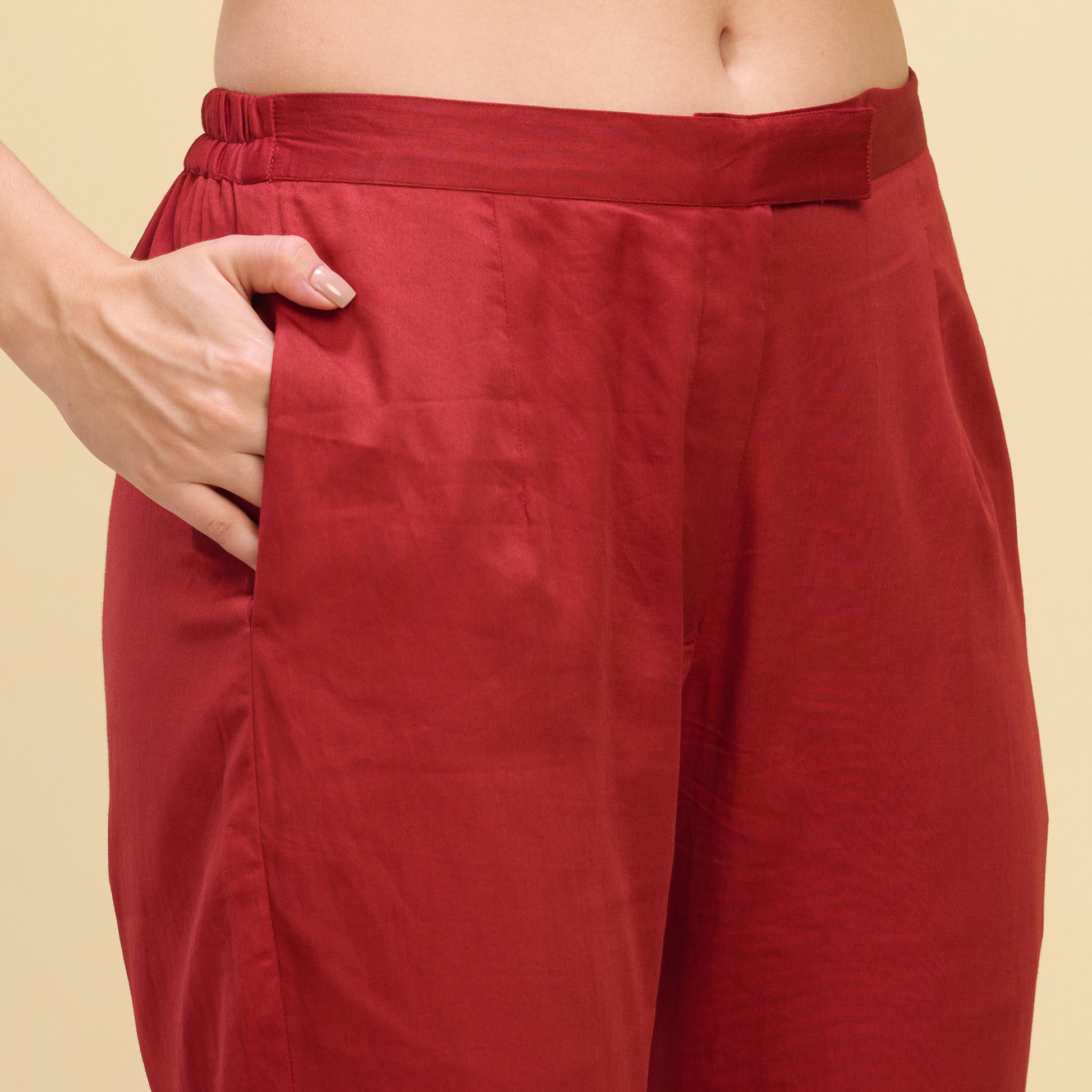 Description The straight trouser with cross hemline combines modern design with timeless comfort. Crafted from durable, comfortable fabric, these trousers feature a semi-elasticated waistband and a hook, eye, and zip closure for a secure fit. The solid colour provides a versatile foundation, while the unique black cross hemline adds a contemporary, stylish touch. Designed with a regular fit, these trousers offer both comfort and sophistication for any occasion. Perfect for casual outings or semi-formal events, they effortlessly elevate your wardrobe.