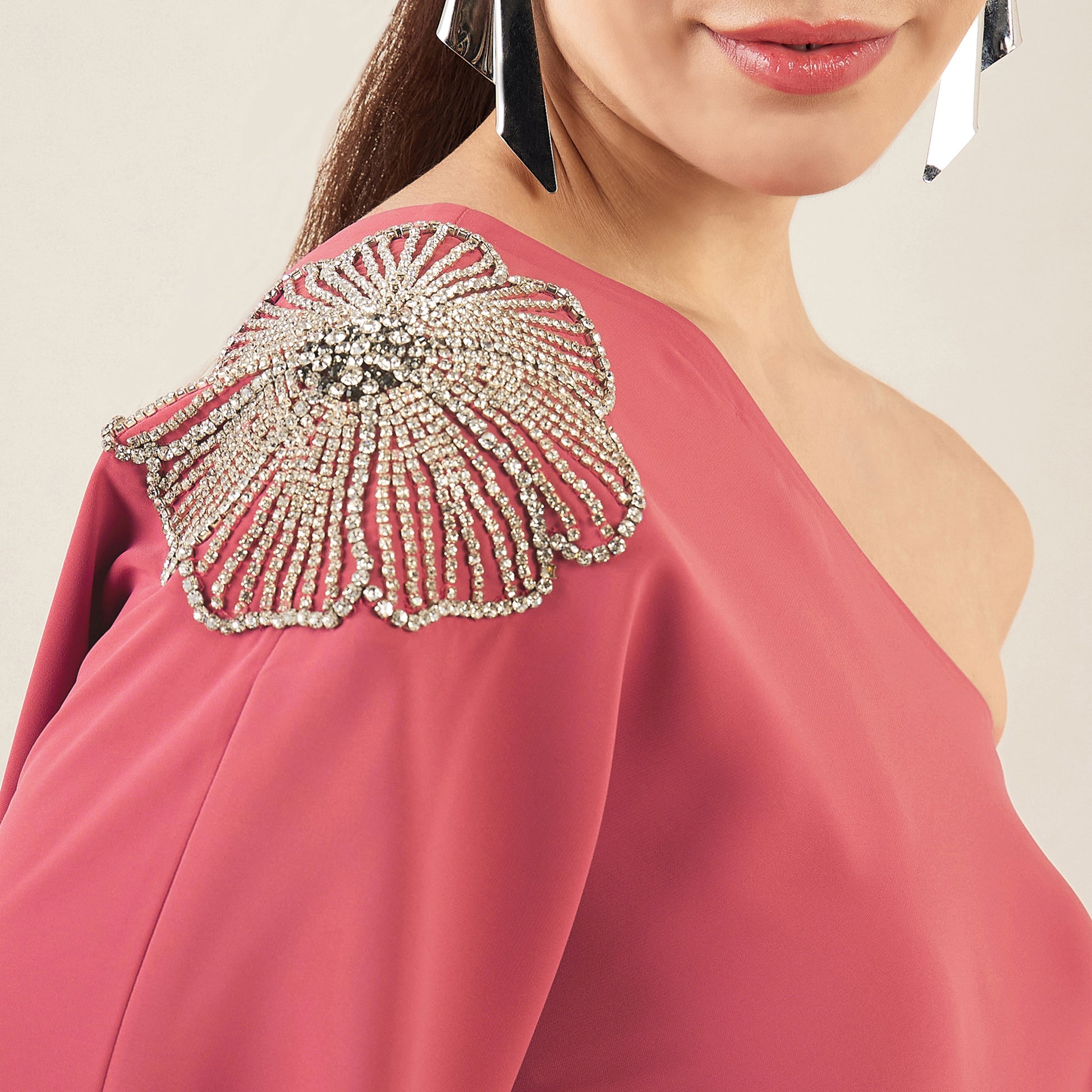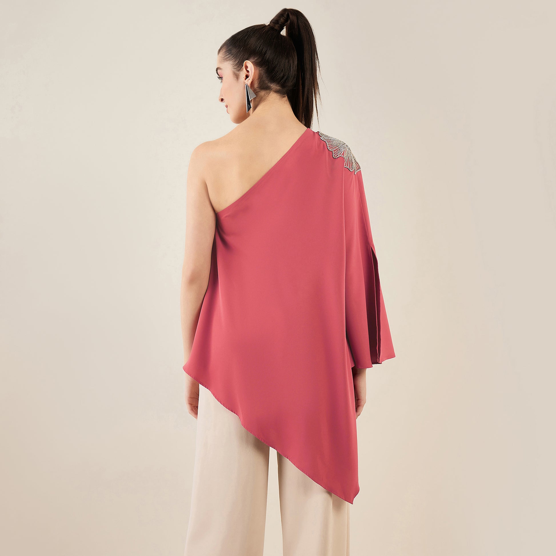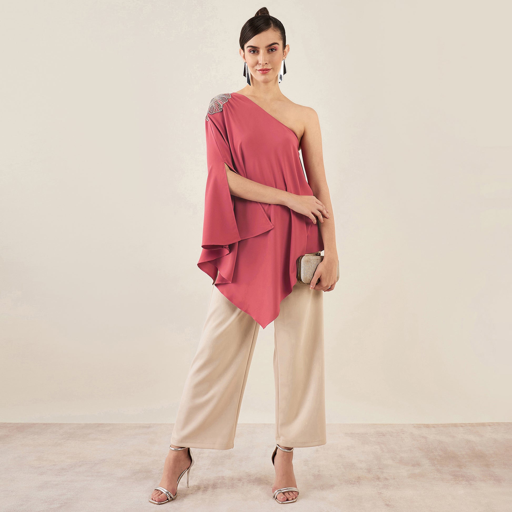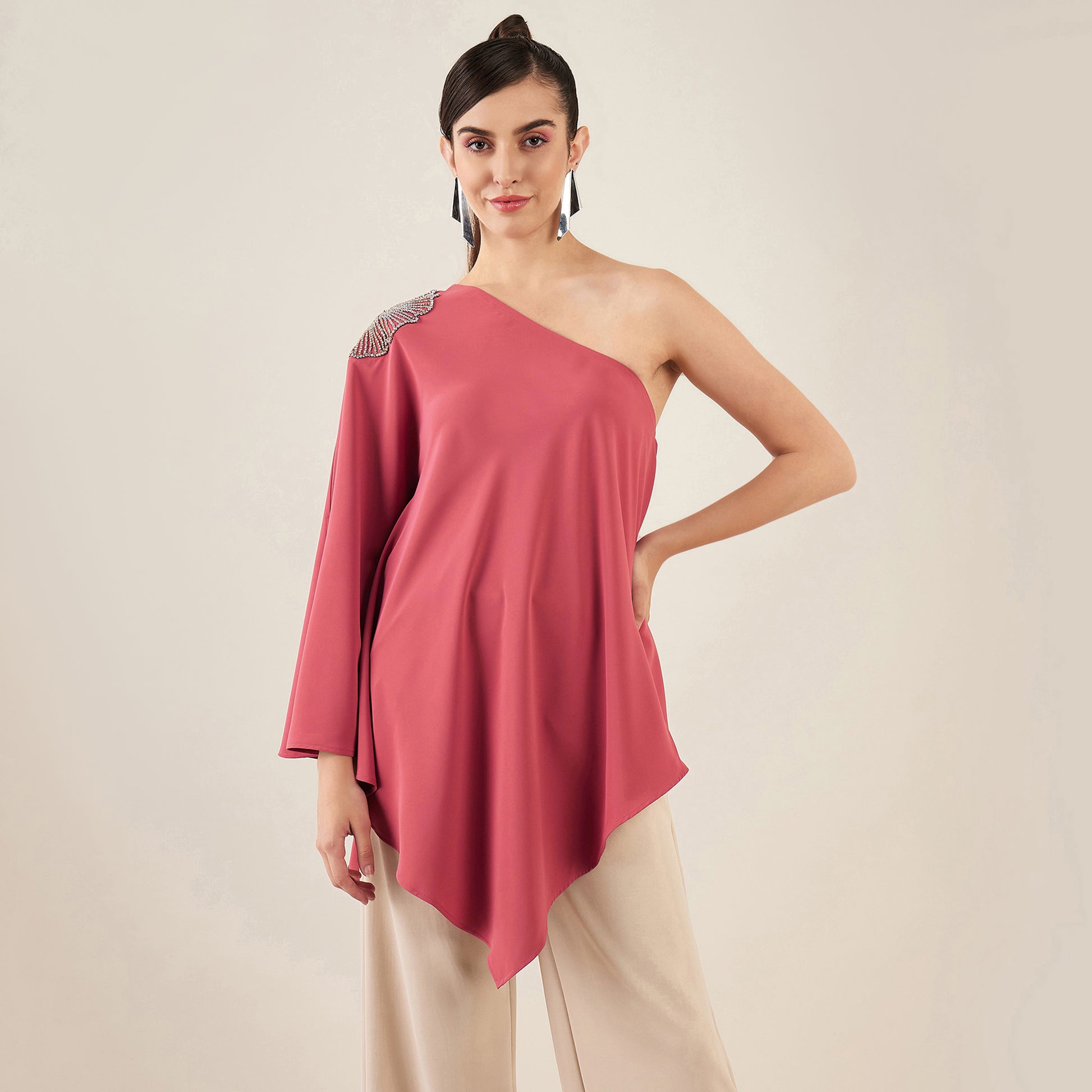 Style Guide Make a fashion statement with our one-shoulder asymmetrical top by accessorising with hoop earrings and strappy heels for a chic look. Let the delicate crystal hand-embroidery on the shoulder take center stage by keeping other accessories minimal. You can pair it with a skinny leather pants for an enhanced evening look. Consider styling your hair in loose waves or a sleek ponytail to complement the asymmetrical silhouette. This versatile top blends modern elegance with ease, providing a go-to ensemble for those who appreciate a fashion-forward and comfortable approach to style.