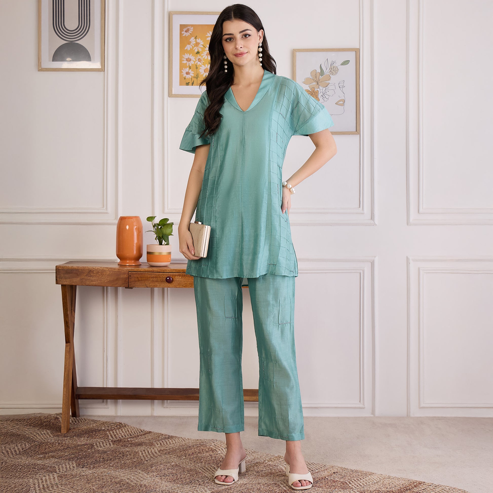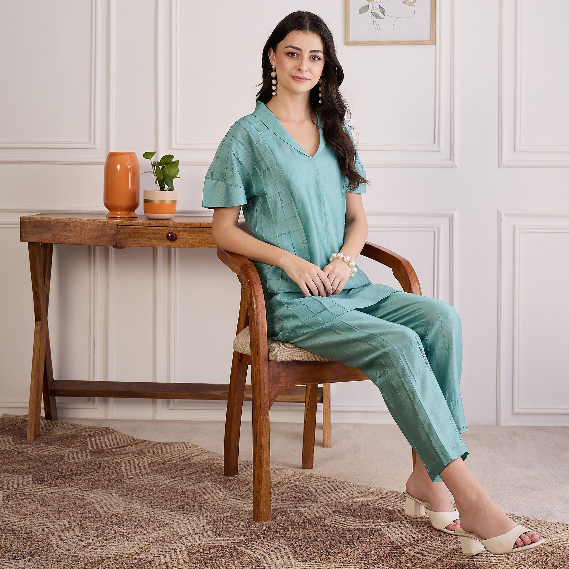 Style Guide Pair this refined top with tapered trousers or a midi skirt for a sleek, put-together look. The pintucks create visual interest, so keep accessories minimal—choose a classic watch or simple earrings. Complete the outfit with loafers or low heels and a crossbody bag. For beauty, a neat ponytail and fresh, matte makeup will highlight the top’s tailored elegance.