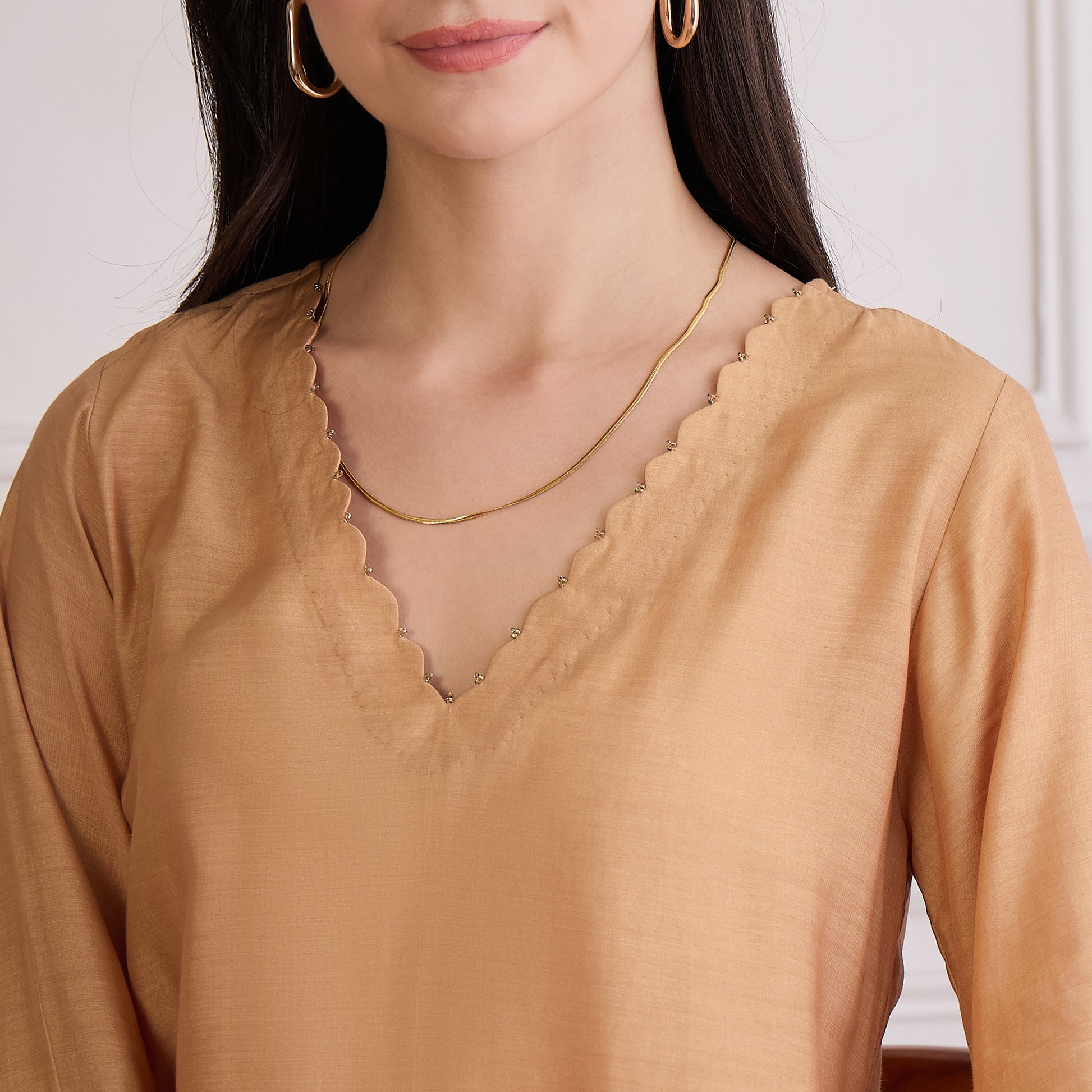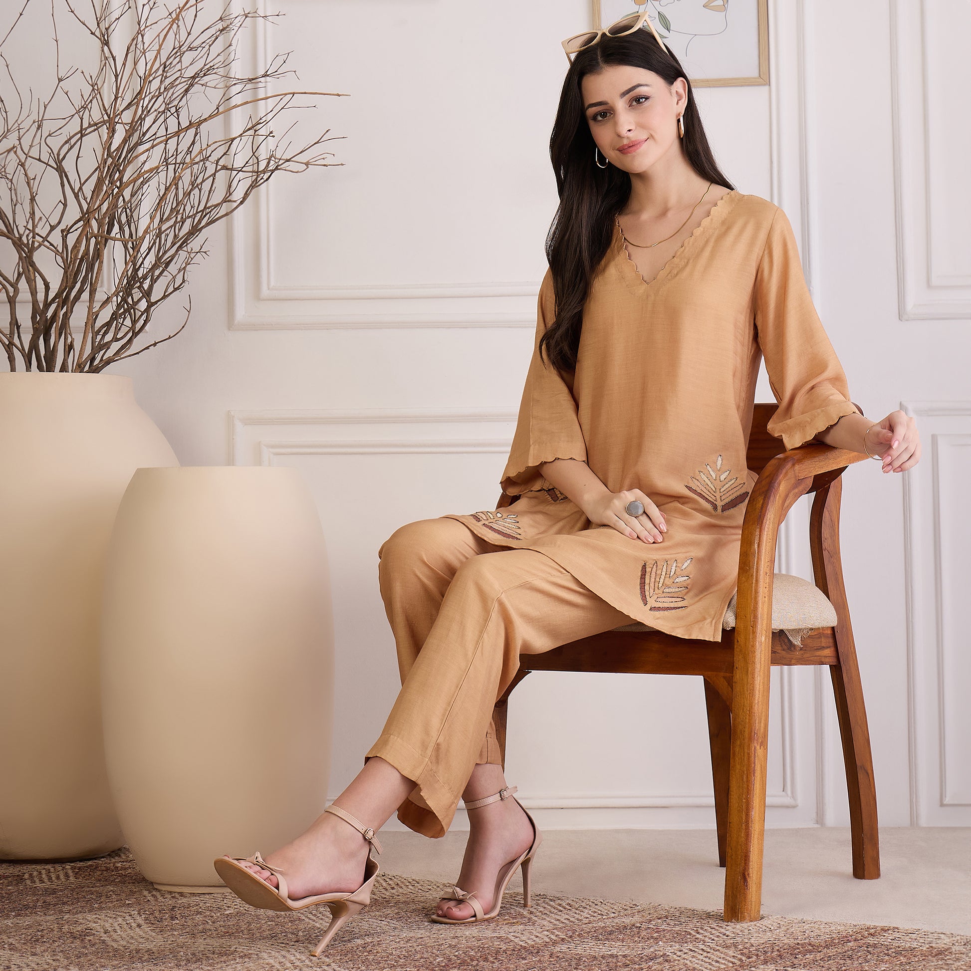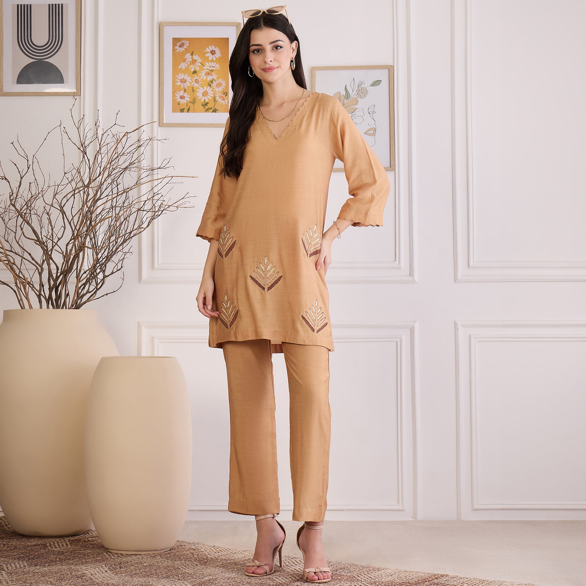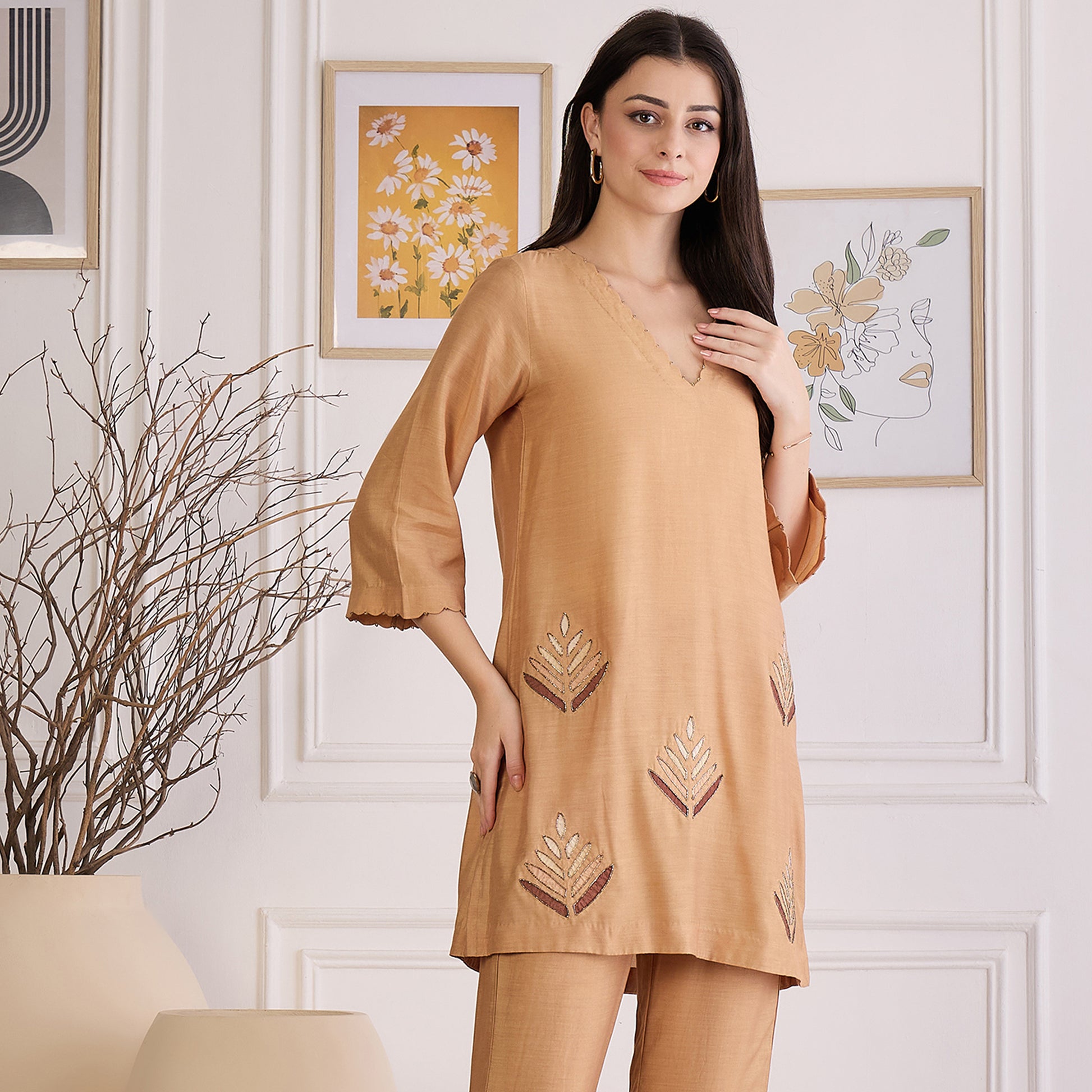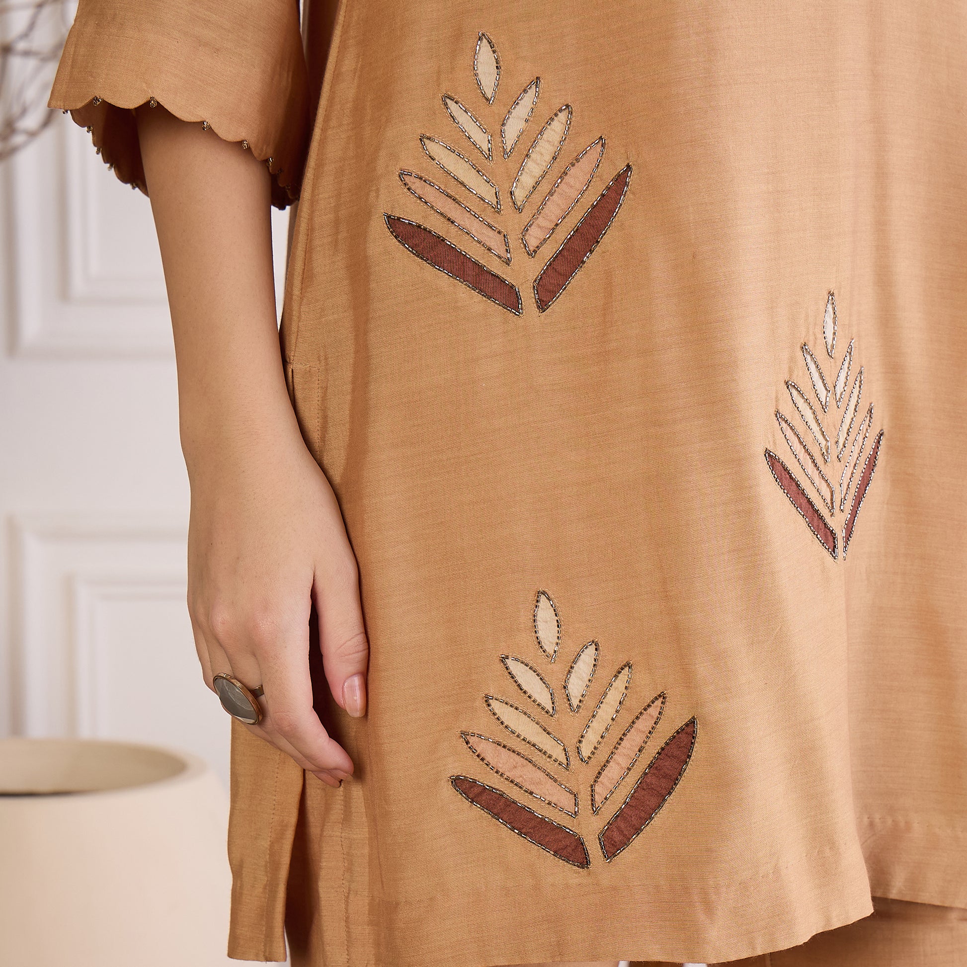 Description Bring an artisanal flair to your wardrobe with this applique kurta adorned with delicate bead detailing. Crafted in a fluid, lightweight fabric, it offers an airy feel and graceful movement. The mix of textured applique and subtle shimmer creates a visually rich design that's equal parts contemporary and timeless—perfect for elevating your everyday style.