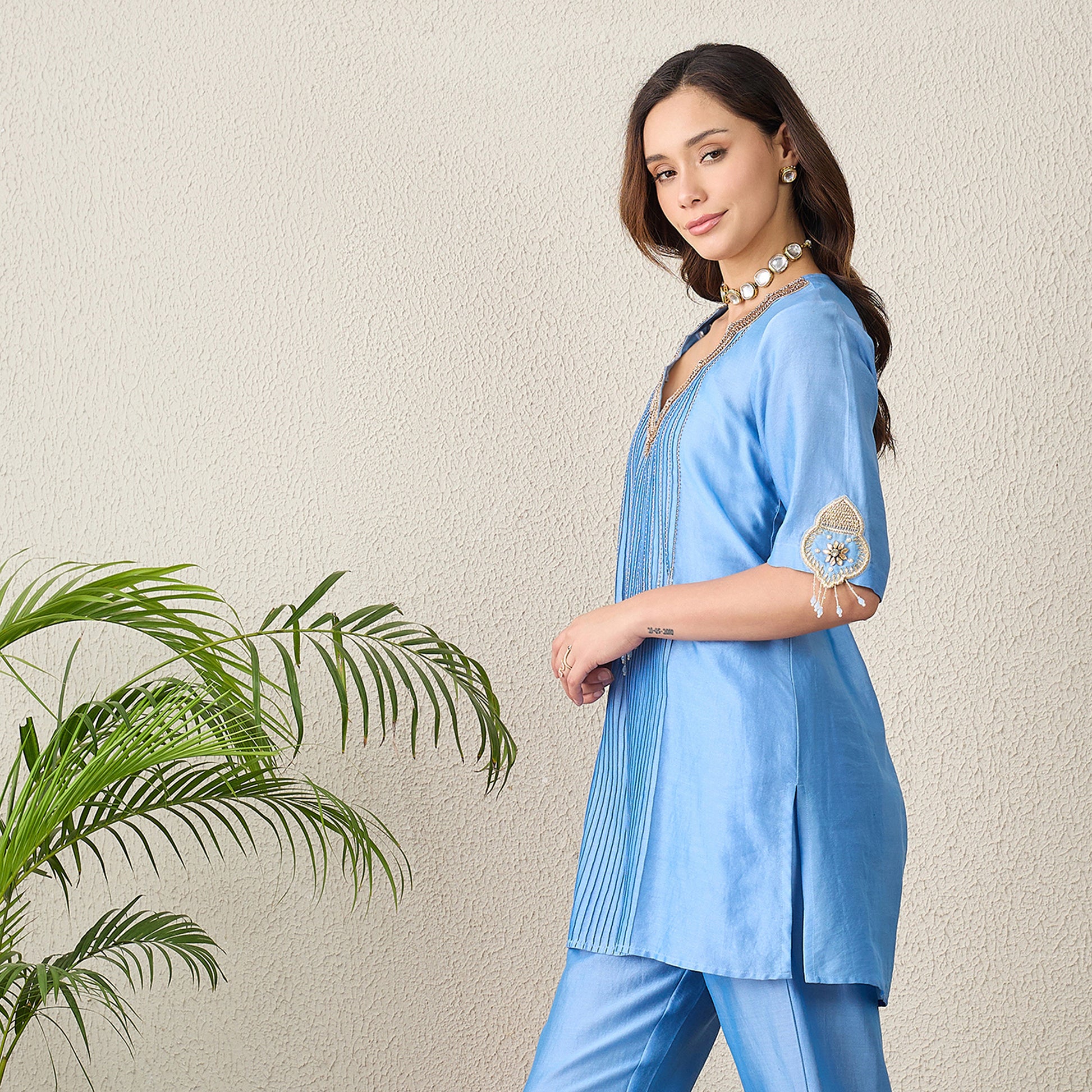 Description This sky blue kurta is crafted from smooth, high-quality fabric and features fine vertical pintuck detailing across the front for a structured, slimming look. The deep V-neckline is highlighted with an intricate scalloped lace border and delicate embroidery. Its elbow-length sleeves are finished with unique metallic motifs and hanging bead accents, adding a playful yet sophisticated touch to the design.