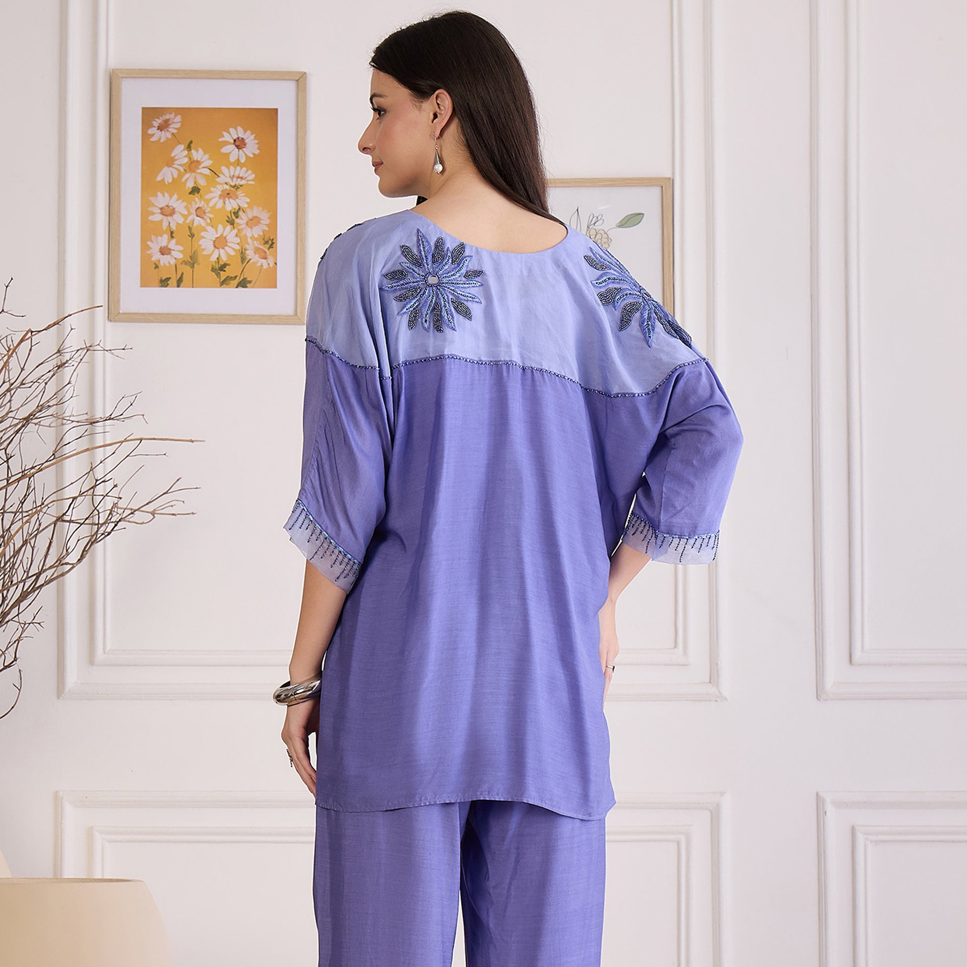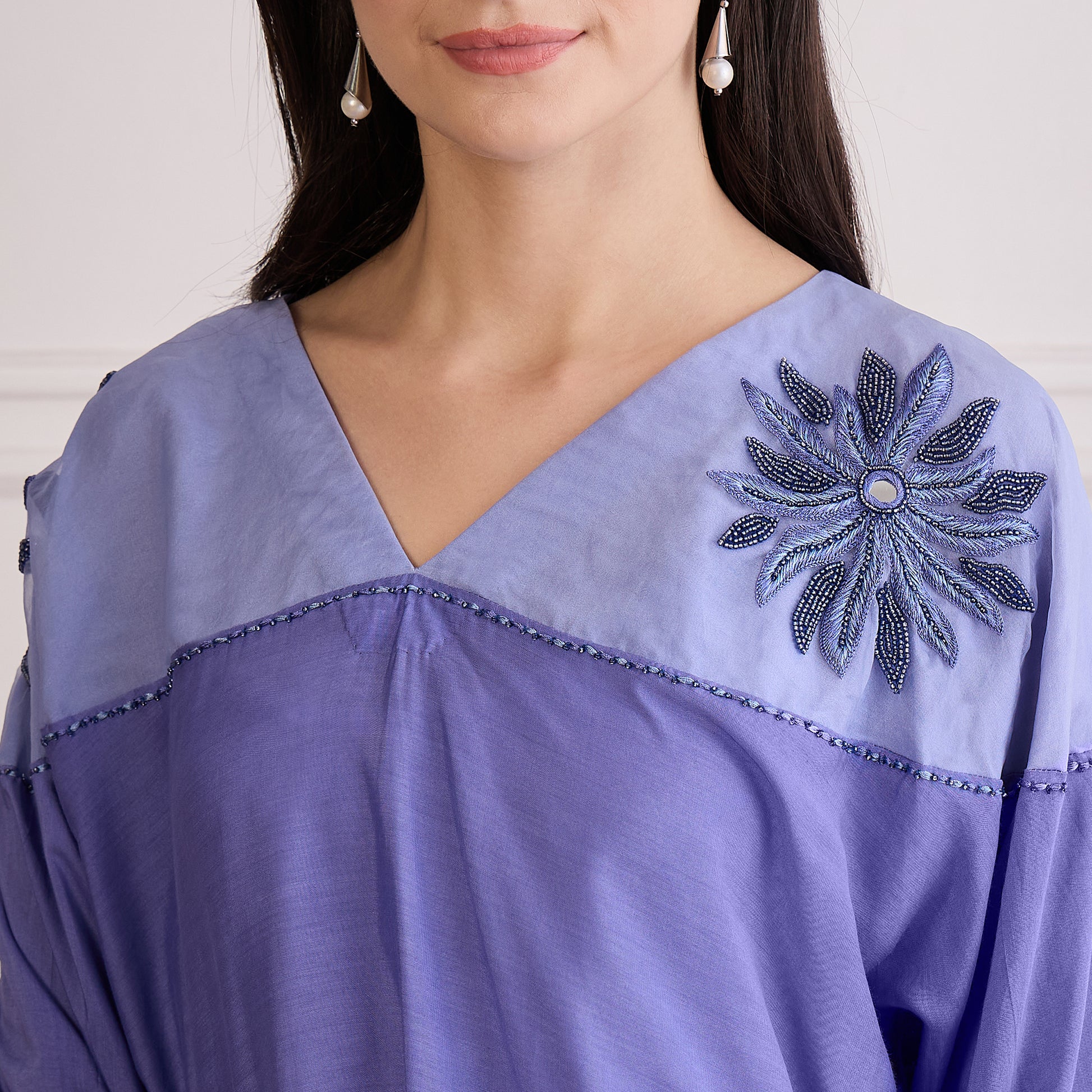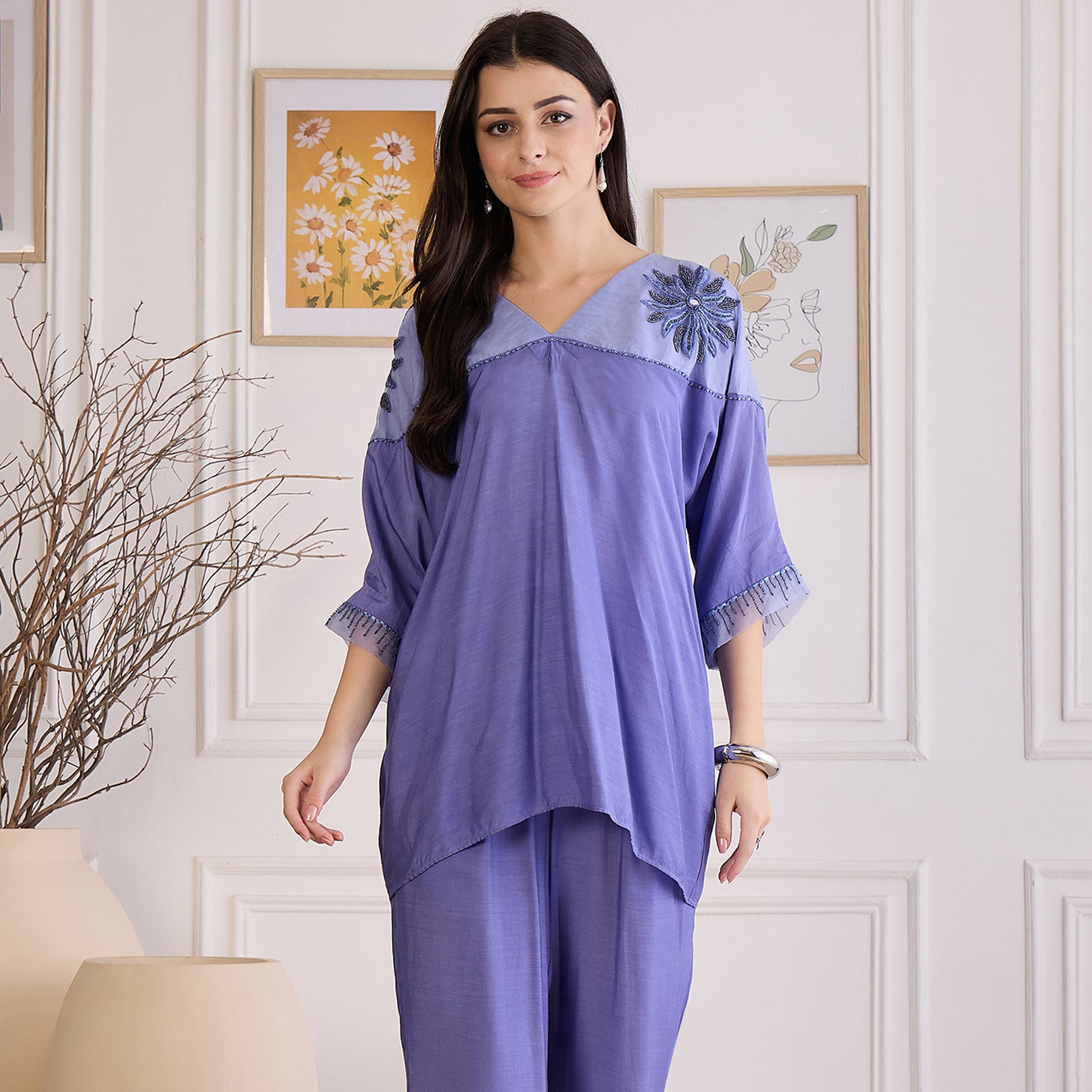 Style Guide Pair this beautifully embroidered top with solid-colored trousers or a flowing skirt to let the intricate beadwork shine. Choose minimal jewelry—such as stud earrings or a simple bracelet—to complement the embroidery without overwhelming it. Finish the look with strappy heels and a chic clutch. Style your hair in soft waves or a sleek ponytail, and opt for glowing, natural makeup with a touch of highlight.