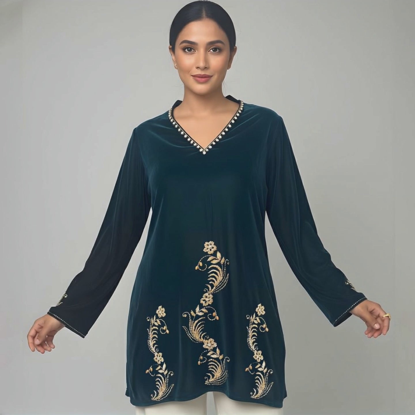 Description Elevate your festive and evening wardrobe with this elegant velvet tunic, adorned with intricate golden embroidery. The V-neckline is delicately highlighted with stone embroidery, adding a refined touch of shimmer. Featuring full sleeves with matching embroidered accents and a flowing silhouette, this piece combines comfort with timeless sophistication. Perfect for celebrations, dinners, and elegant day-to-night transitions.