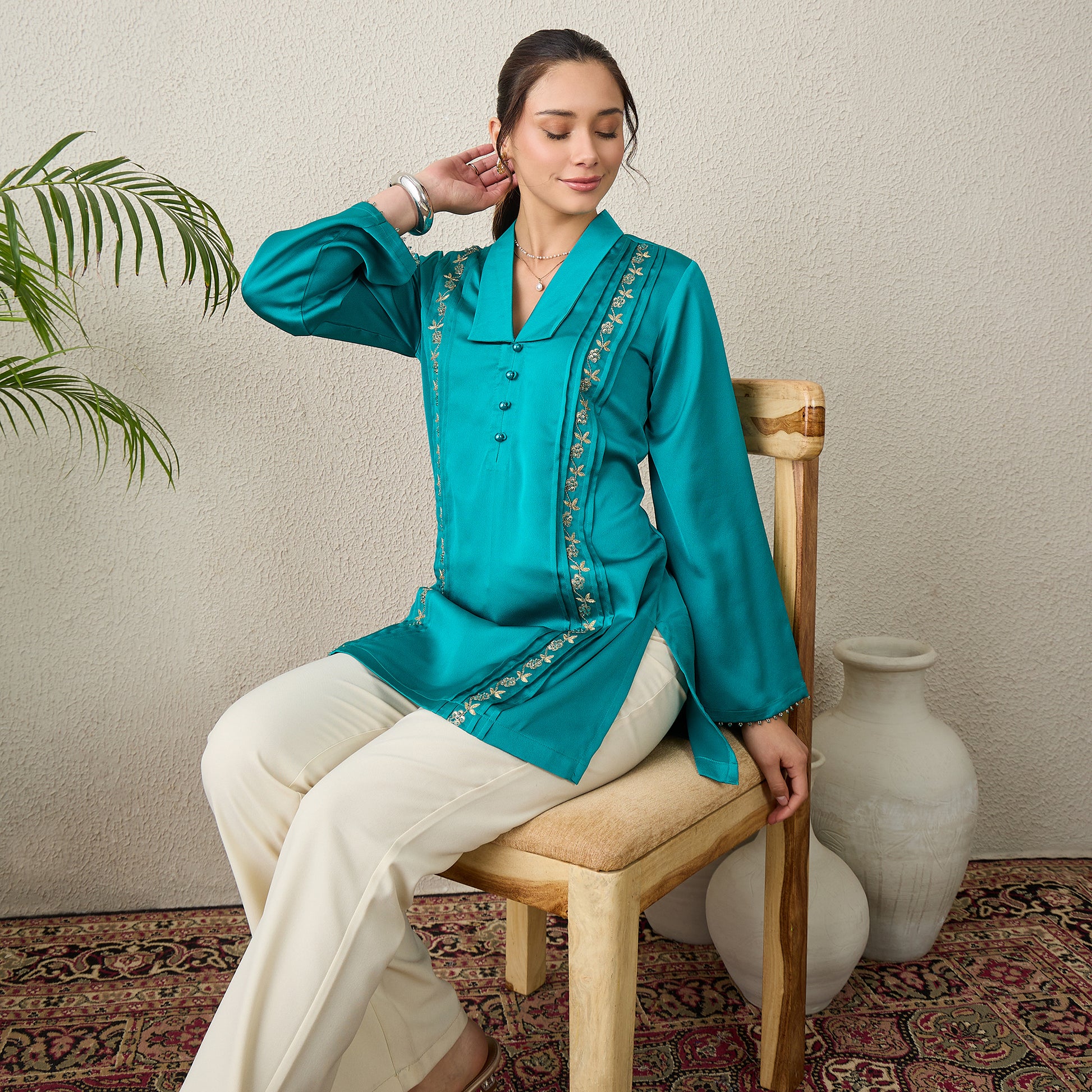 Description Featuring structured vertical space-tucks, this top offers a unique textured appearance and a tailored fit. The design is elevated by delicate hand-embroidery along the seams and neckline, providing a minimalist yet deeply detailed approach to modern luxury.