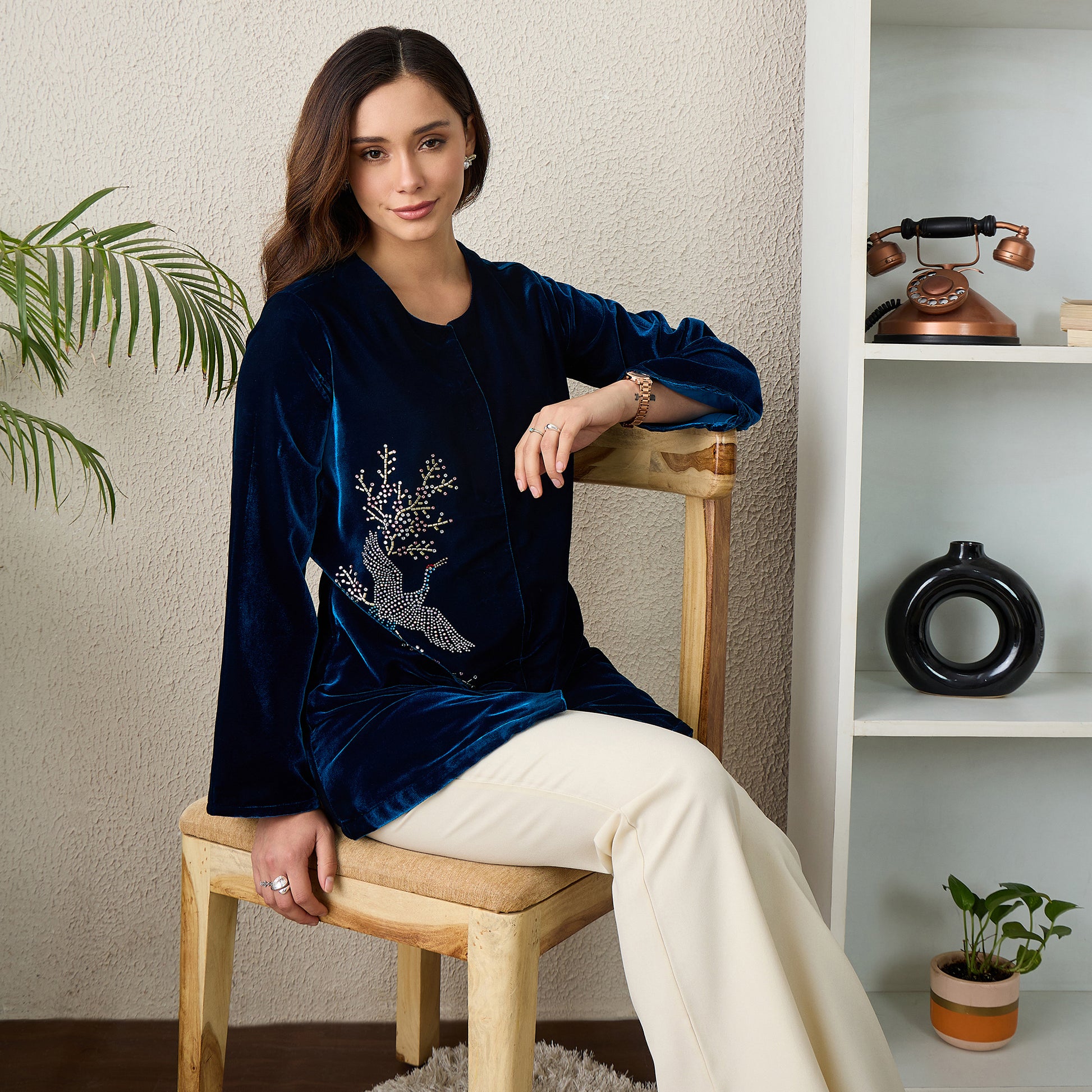 Description This velvet jacket features a soft, lustrous finish with a clean, relaxed silhouette. Designed with a round neckline and long sleeves, it offers an elegant yet comfortable fit. Delicate bead and crystal embellishments create a graceful bird motif intertwined with fine branch details, adding subtle texture and refined sparkle. The smooth velvet base enhances the intricate craftsmanship, giving the piece a luxurious and timeless appeal.