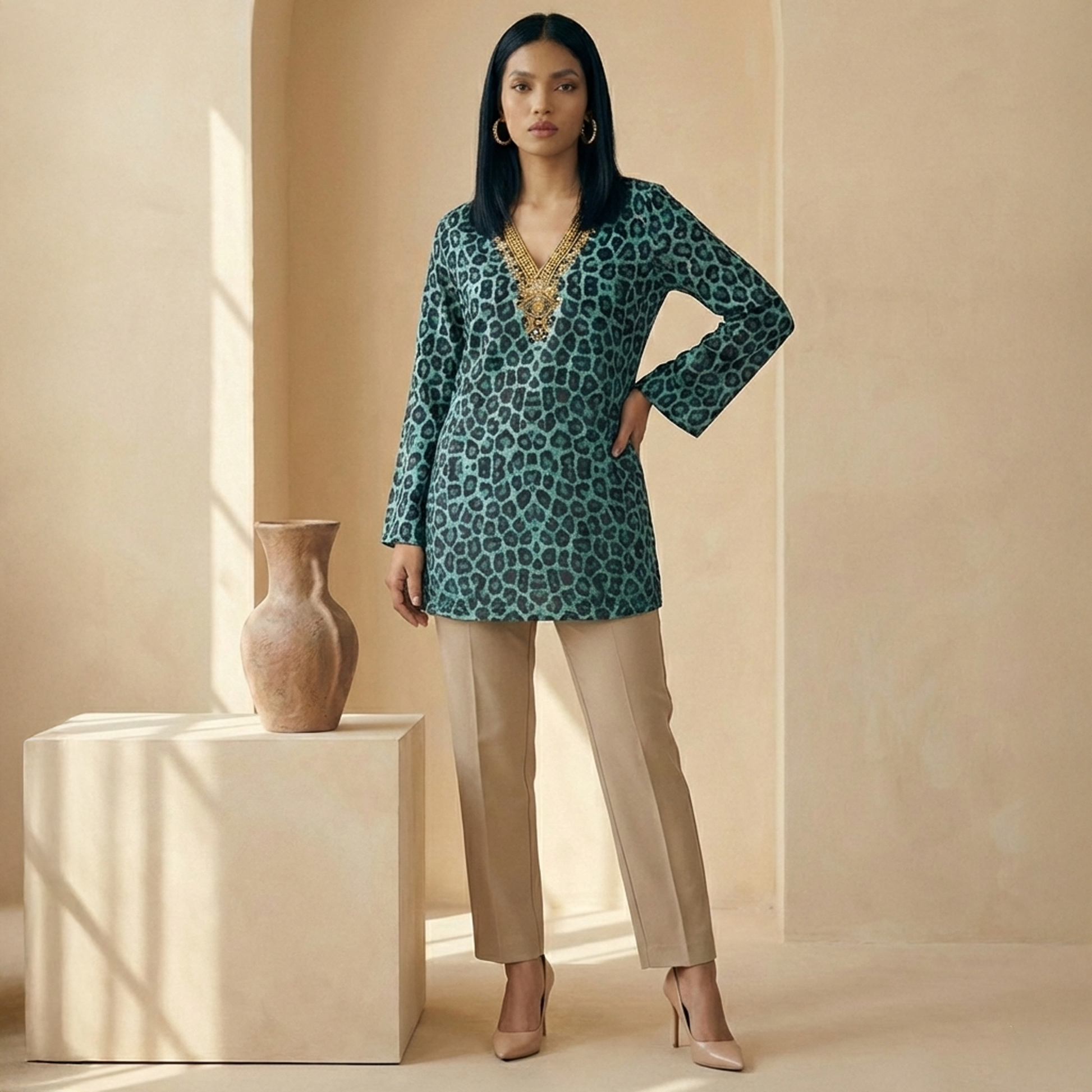 Style Guide Pair this top with neutral trousers or off-white pants for a balanced, polished look. For a casual outing, style it with straight-fit jeans and minimal accessories. Elevate it for an evening or resort look by adding statement earrings and flat sandals or block heels. Keep makeup soft and warm to complement the earthy print.