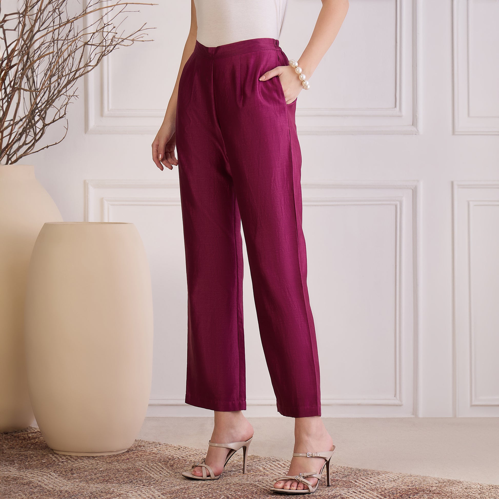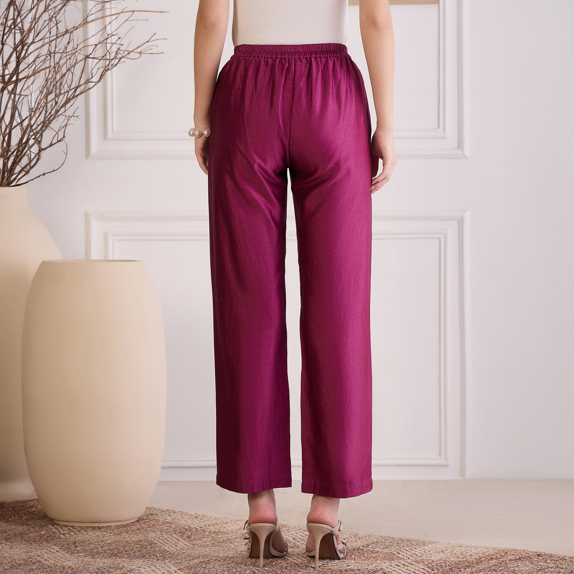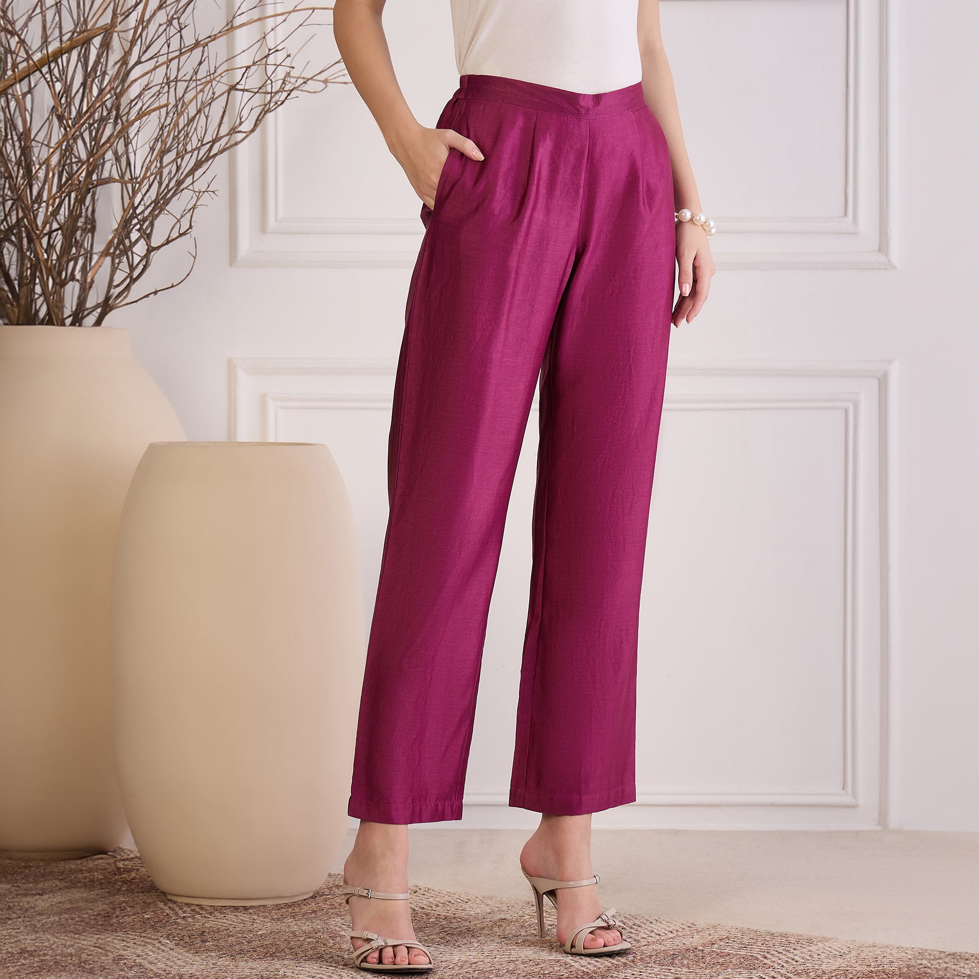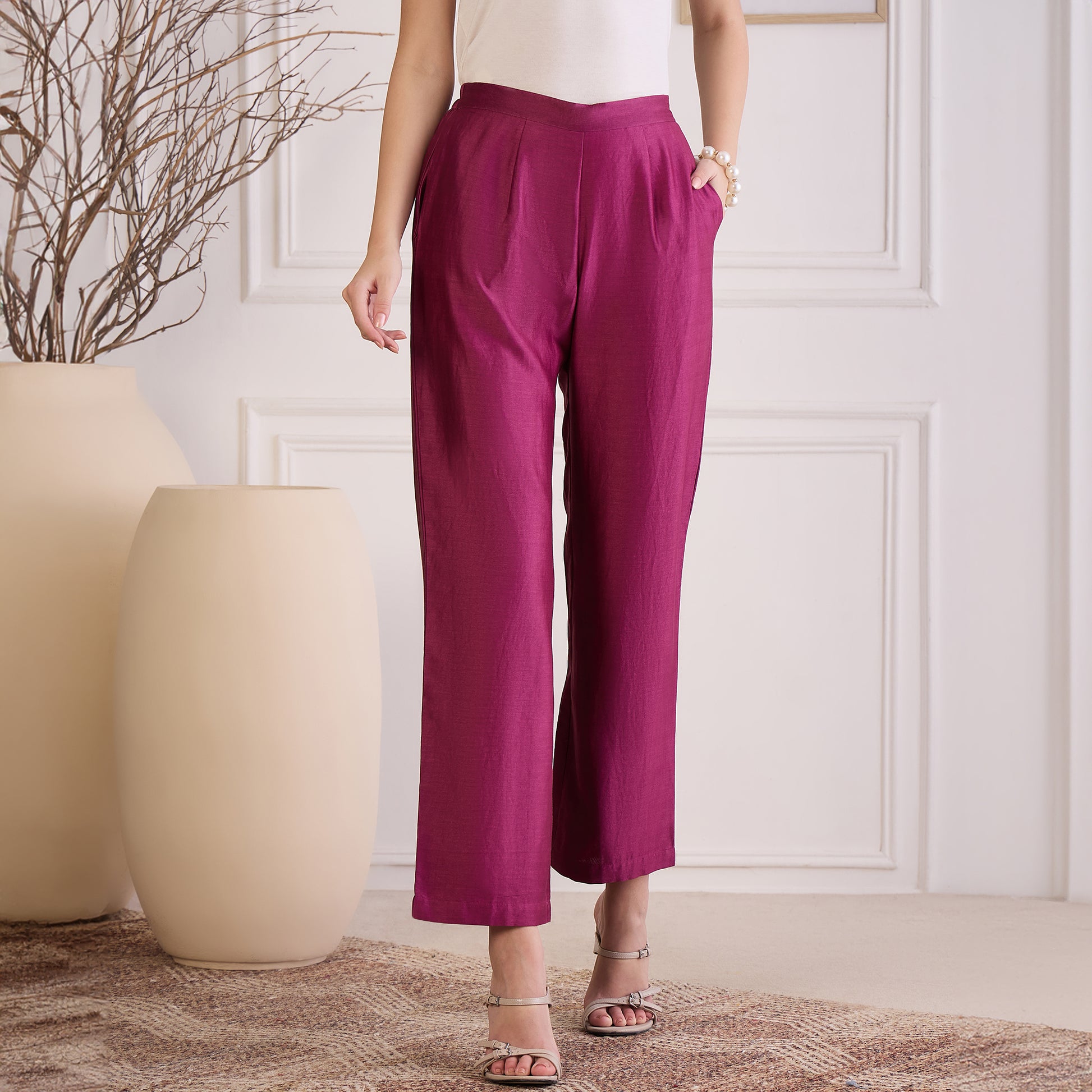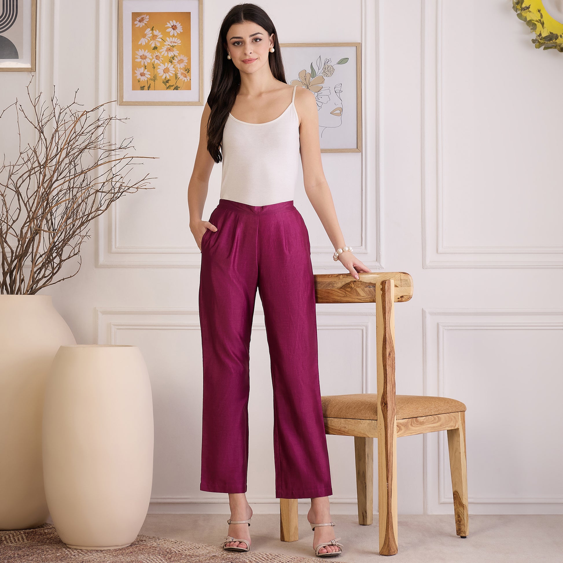 Style Guide Pair these straight pants with a tailored kurta, crisp shirt, or a flowy tunic to create a balanced, polished look. For cooler days, layer with a longline shrug or a structured blazer for added sophistication. Footwear options like block heels, mules, or embellished flats will complement the clean silhouette while keeping it versatile. Keep accessories minimal yet refined—think delicate earrings or a sleek watch to enhance the overall ensemble. Finish with a tote for workdays or a clutch for evenings out, ensuring a look that’s both effortless and elegant.