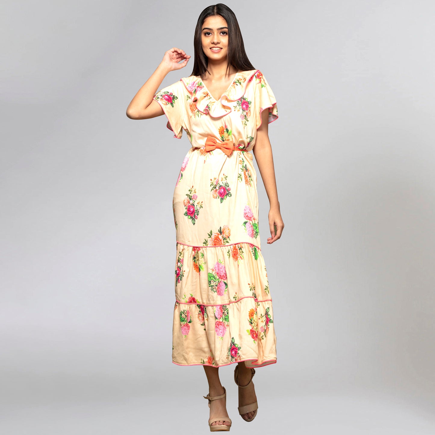Description Whether you're stepping out for some coffee or staying in, carry this easy and fashion-forward pink floral dress. It is enhanced with ruffles at neckline and hem finished with pink piping. Adjustable waistband with hanging tassels is for the perfect fit and look.